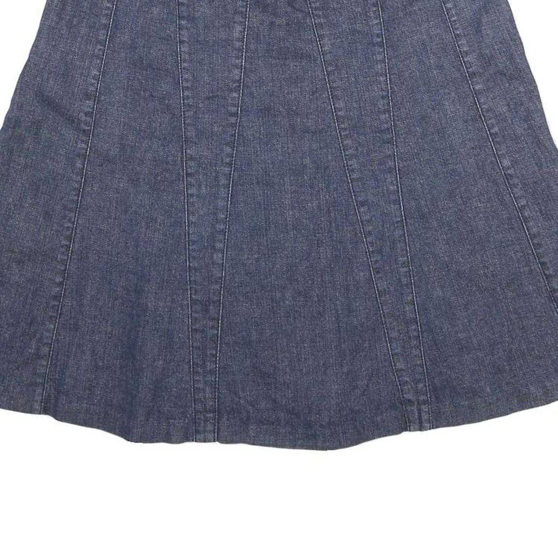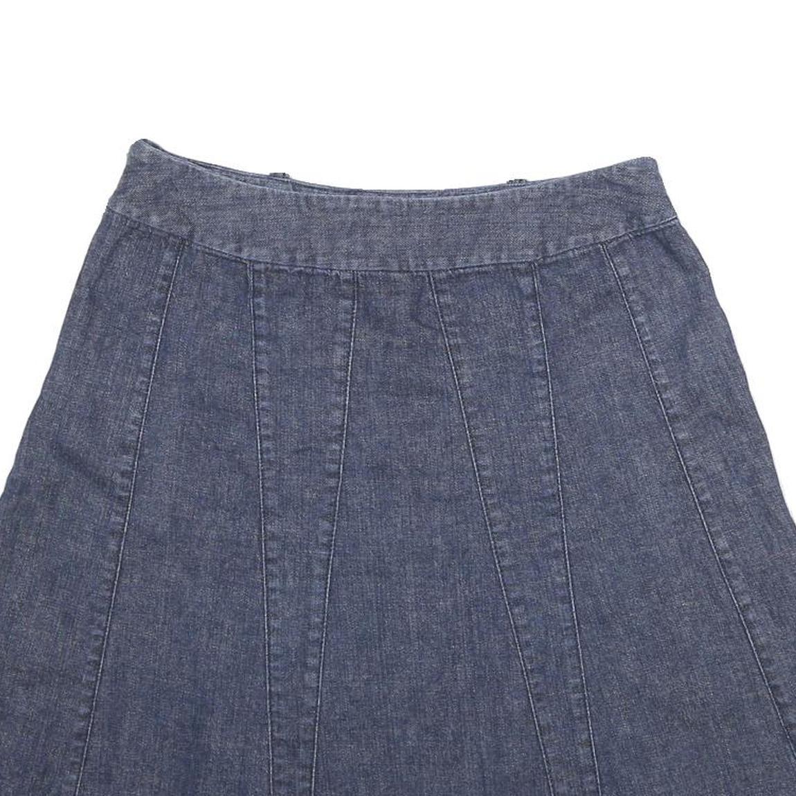 This ANN TAYLOR skirt is crafted from a cotton blend fabric in a classic blue denim colour, offering a soft and comfortable feel. It features vertical panel detailing that enhances its A-line silhouette, creating a flattering and versatile shape. The skirt fastens with buttons at the waistband for a secure fit.
