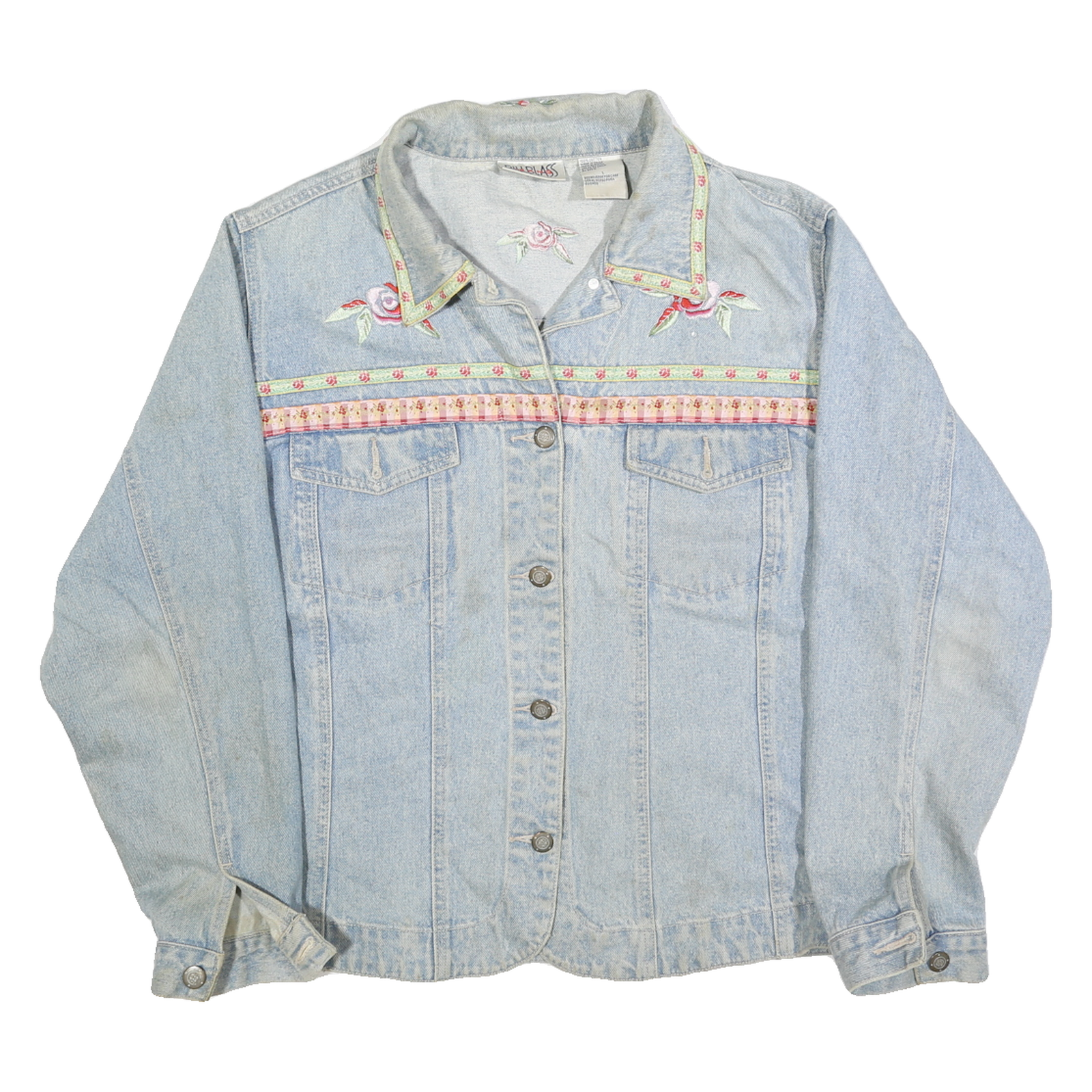 BILLBLASS Womens Blue Denim Cotton Button Jacket L Floral Embroidery Classic