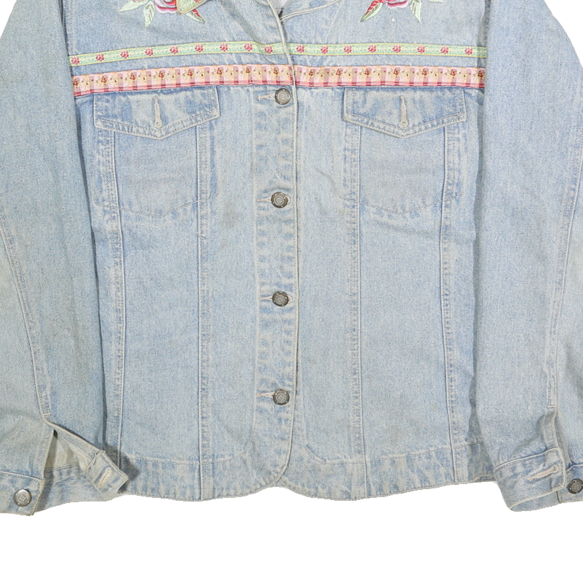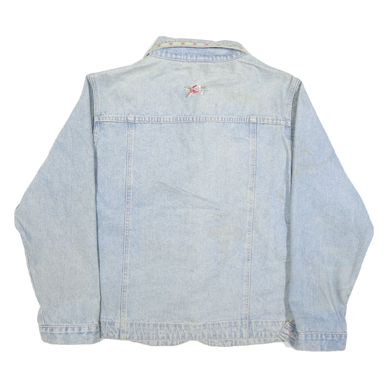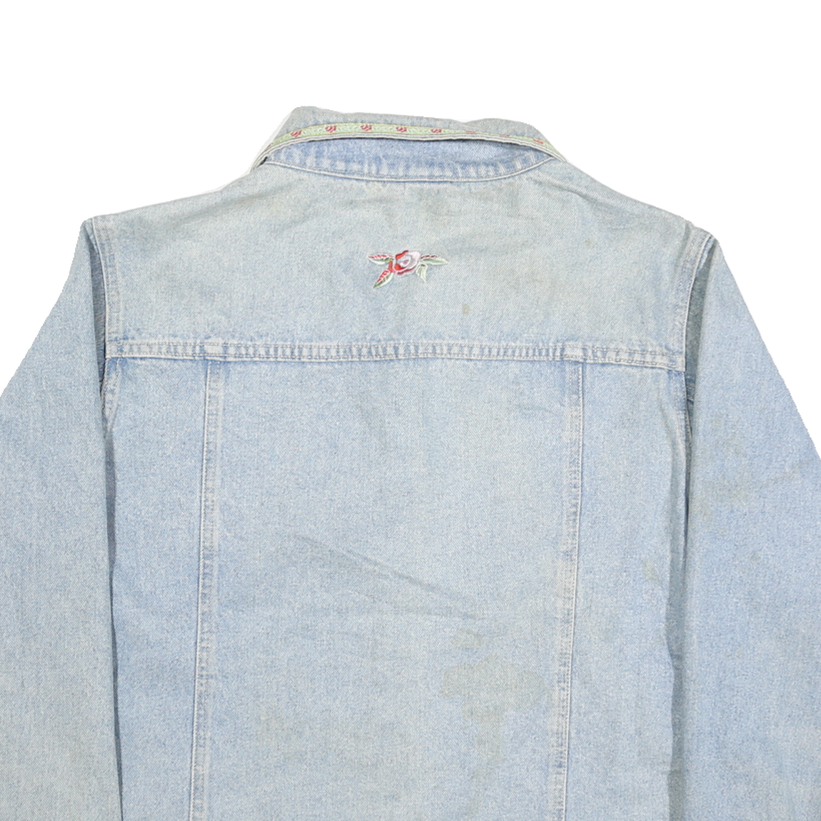 This Billblass womens jacket is crafted from denim cotton in a classic light blue shade. It features delicate floral embroidery in soft pink and green hues across the chest, collar, and back, adding a feminine touch to the timeless design. The jacket closes with silver-tone buttons and has dual chest flap pockets for a traditional denim jacket silhouette.
