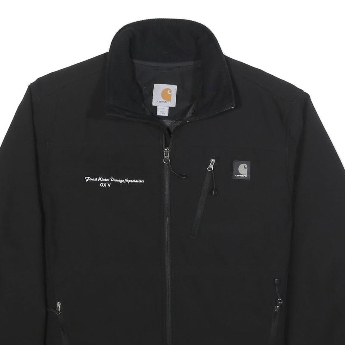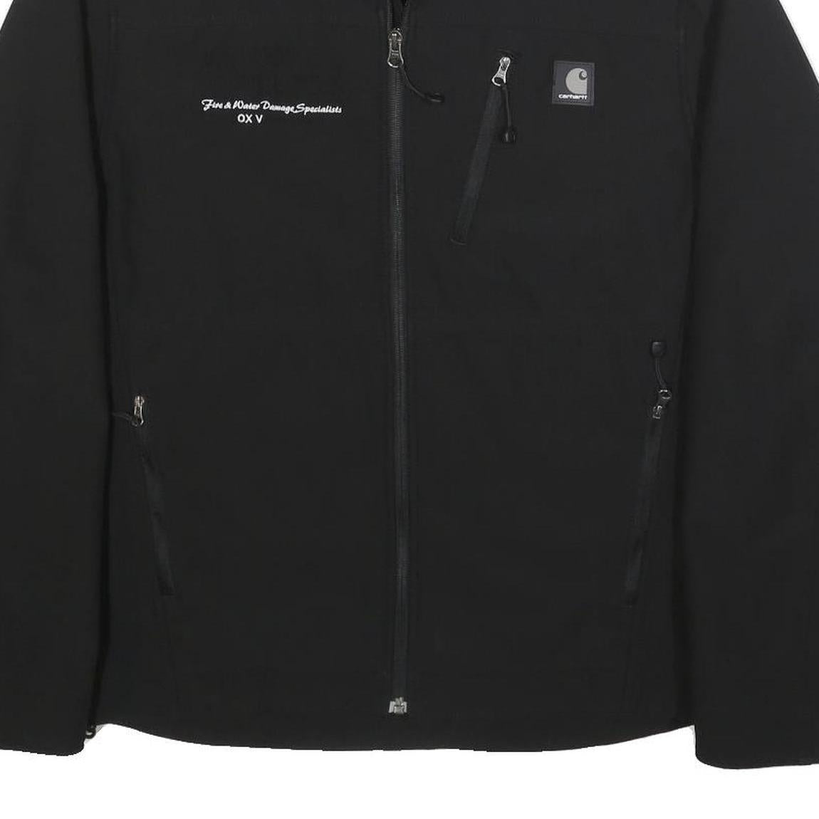 This Carhartt mens jacket features a solid black colour with subtle branded detailing including the Carhartt logo patch on the chest and embroidered text reading 'Fire & Water Damage Specialists OX V'. The jacket has a functional zip closure and multiple zippered pockets for secure storage. Its design is practical and suitable for workwear or casual use.