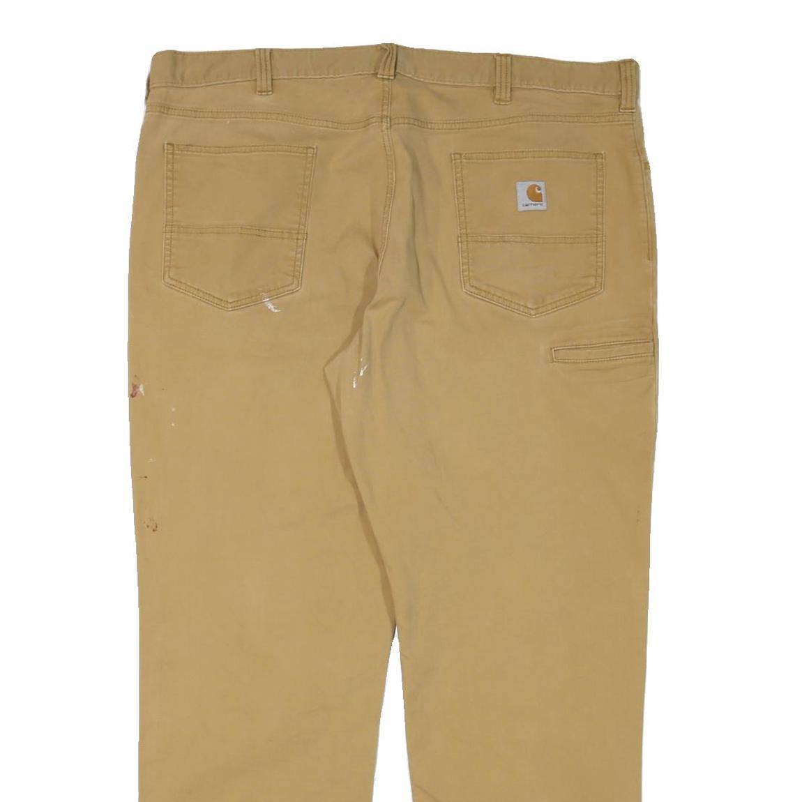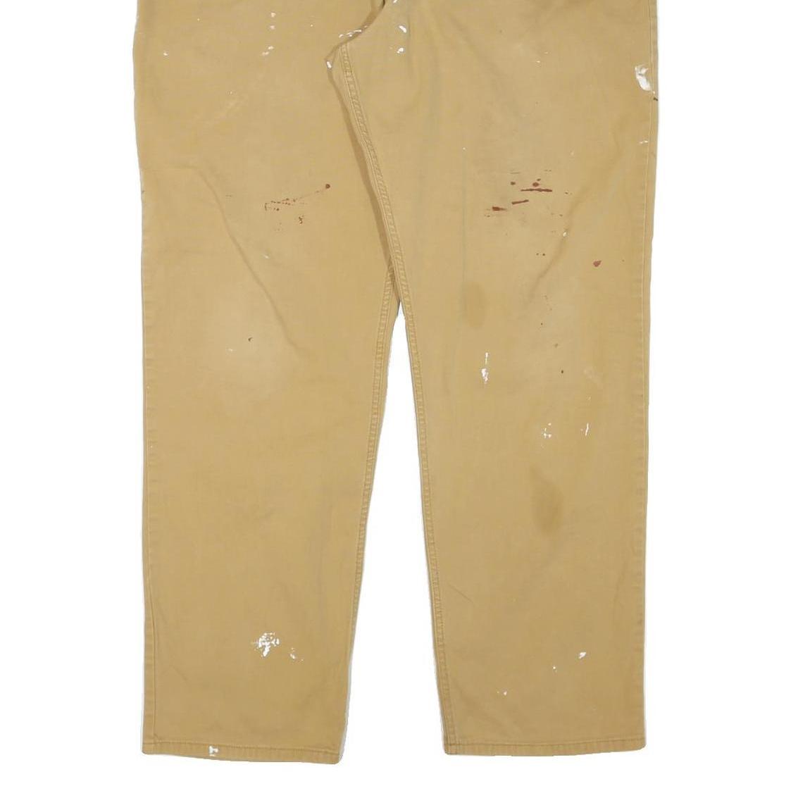 These Carhartt mens trousers are made from a durable cotton blend fabric in a classic beige colour. They feature a relaxed fit and straight leg cut, designed for comfortable all-day wear. The trousers have visible wear marks including small paint splatters and some light staining, adding to their rugged workwear aesthetic.