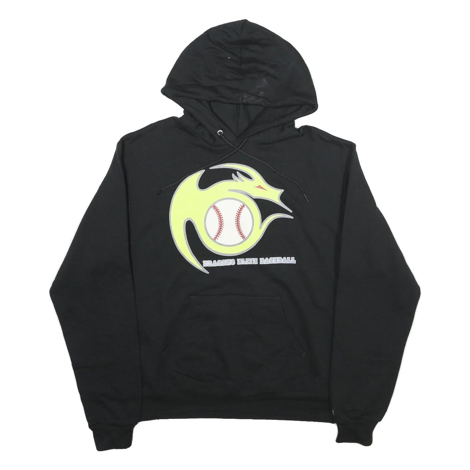 This Champion mens hoodie is crafted from a comfortable cotton blend in a solid black colour. The front features a large graphic print of a stylised yellow dragon curling around a baseball, with the text "Dragons Elite Baseball" underneath. It has a classic pullover style with an adjustable drawstring hood and a kangaroo pocket for convenience.