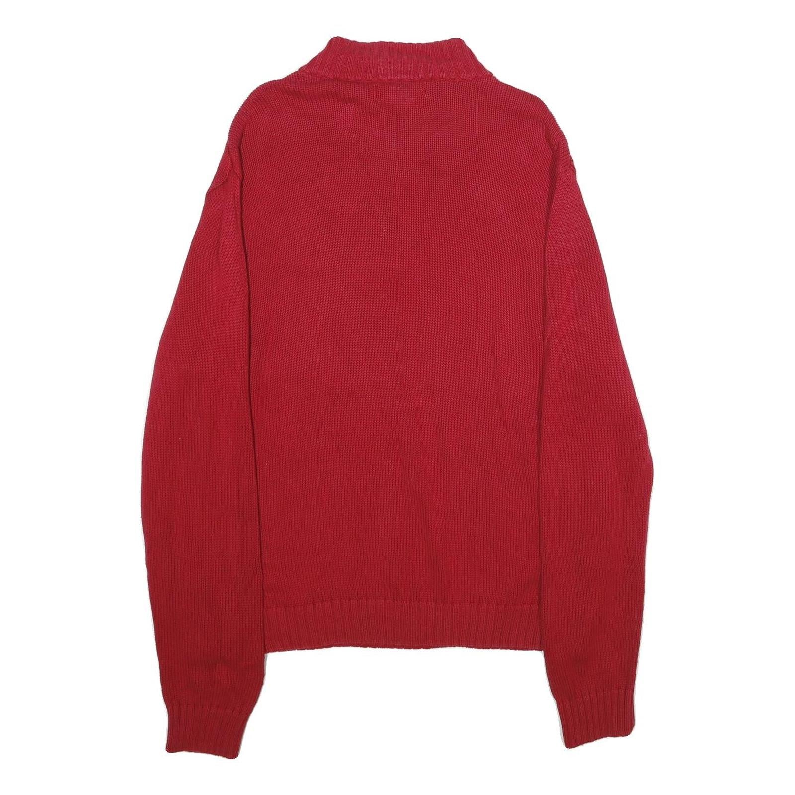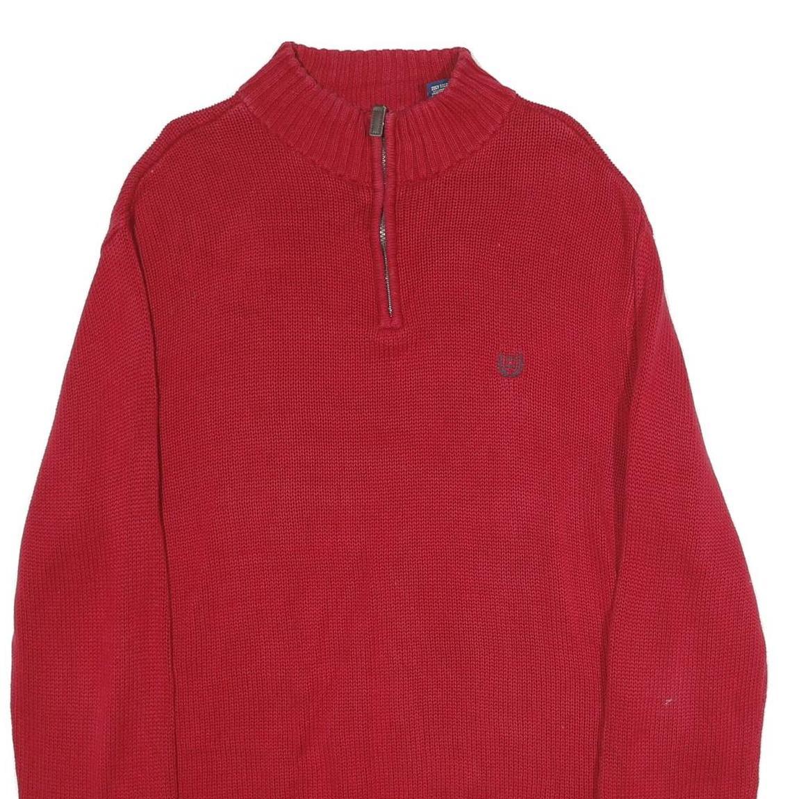 This classic Chaps jumper is crafted in a vibrant red shade, featuring a subtle embroidered logo crest on the chest for distinguished branding. The pullover design includes a ribbed crew neck, cuffs, and hem, with a partial zip closure detail providing added versatility. The plain knit texture creates a timeless look suitable for both casual and smart-casual occasions.