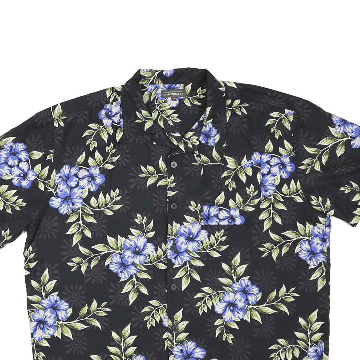 This DENVERHAYES mens shirt features a bold black base adorned with vibrant blue floral prints complemented by green leafy accents. The button-up design and classic collar reflect a traditional Hawaiian style, making this shirt perfect for casual, summery wear.