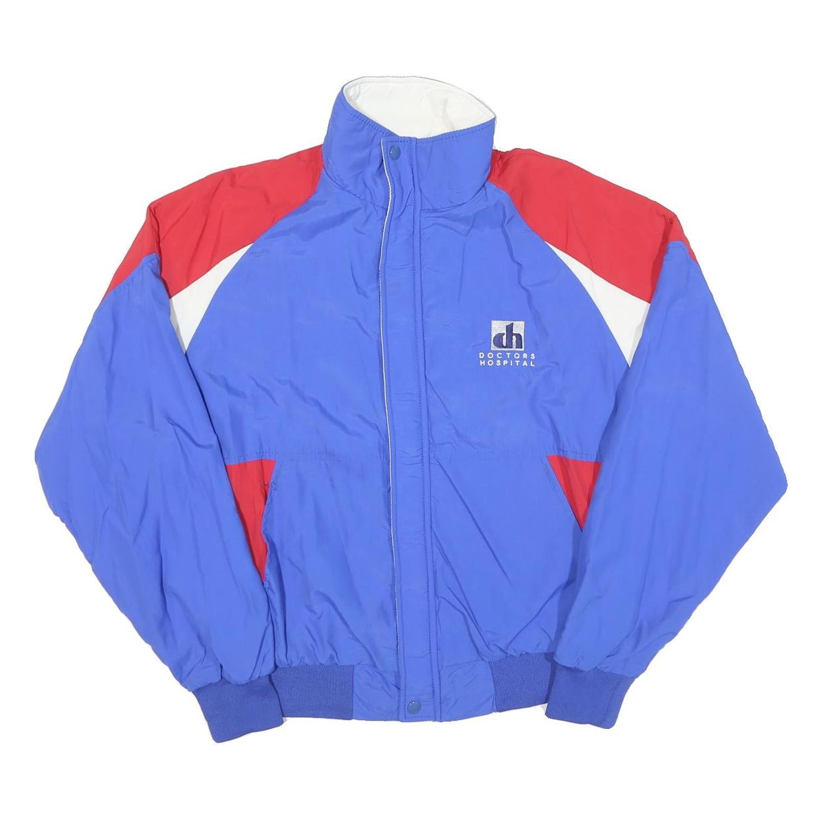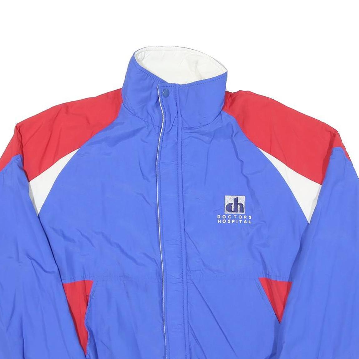 This mens jacket by Dunbroke features a vibrant blue base complemented by red and white accents on the shoulders and pockets. It has a distinctive logo on the chest reading 'doctors hospital,' adding unique character to the piece. The jacket fastens with a zip closure hidden beneath a protective flap with snap buttons for added wind protection.
