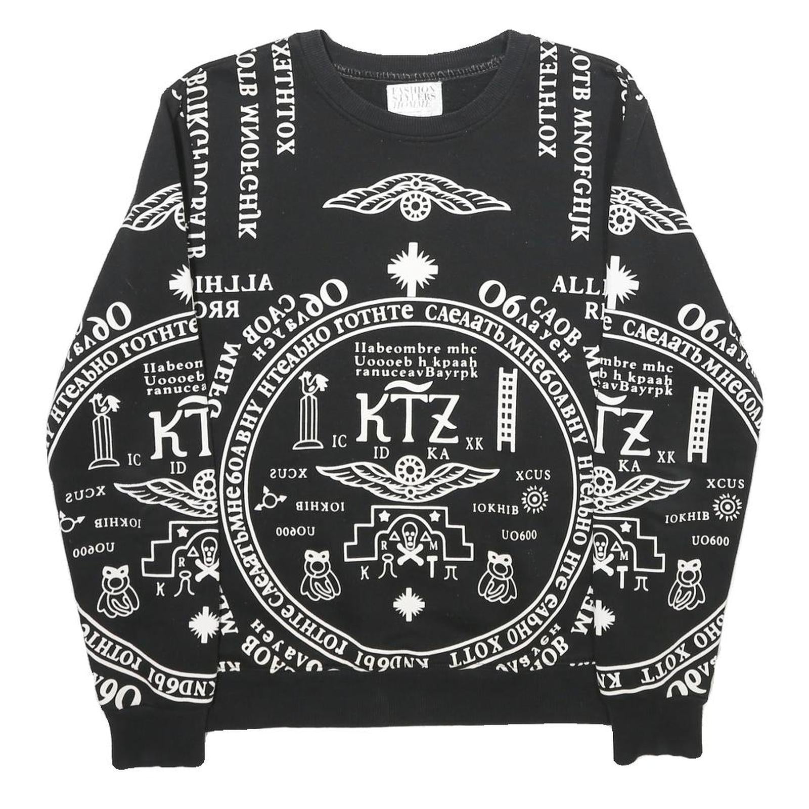 This Mens sweatshirt by FASHION STYLERS HOMME is crafted in cotton and features an all-over white graphic print on a black base. The striking designs include symbols, lettering, and various motifs that create a bold and distinctive look. It has a classic crew neckline and long sleeves with fitted cuffs.
