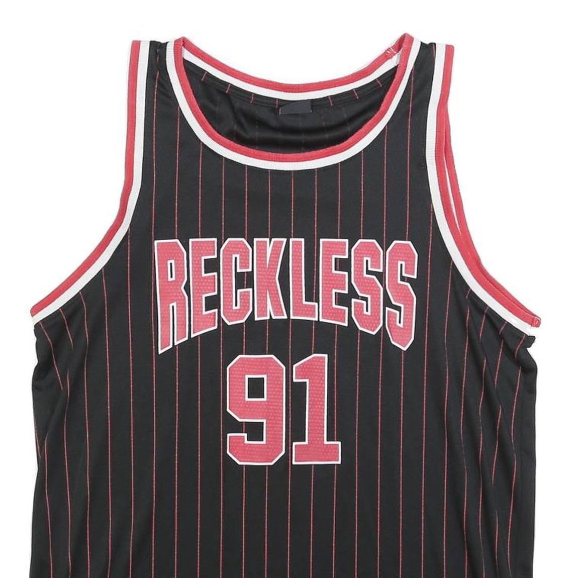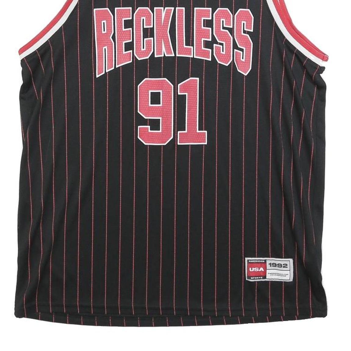 This FSBN Mens sleeveless jersey features a bold black base with thin red pinstripes, highlighted by red and white trims on the neckline and armholes. The front displays prominent "RECKLESS" lettering above the large number 91, both in red with white outlines, creating a sporty, athletic aesthetic. A patch near the hem reads "USA 1992" for added detail.