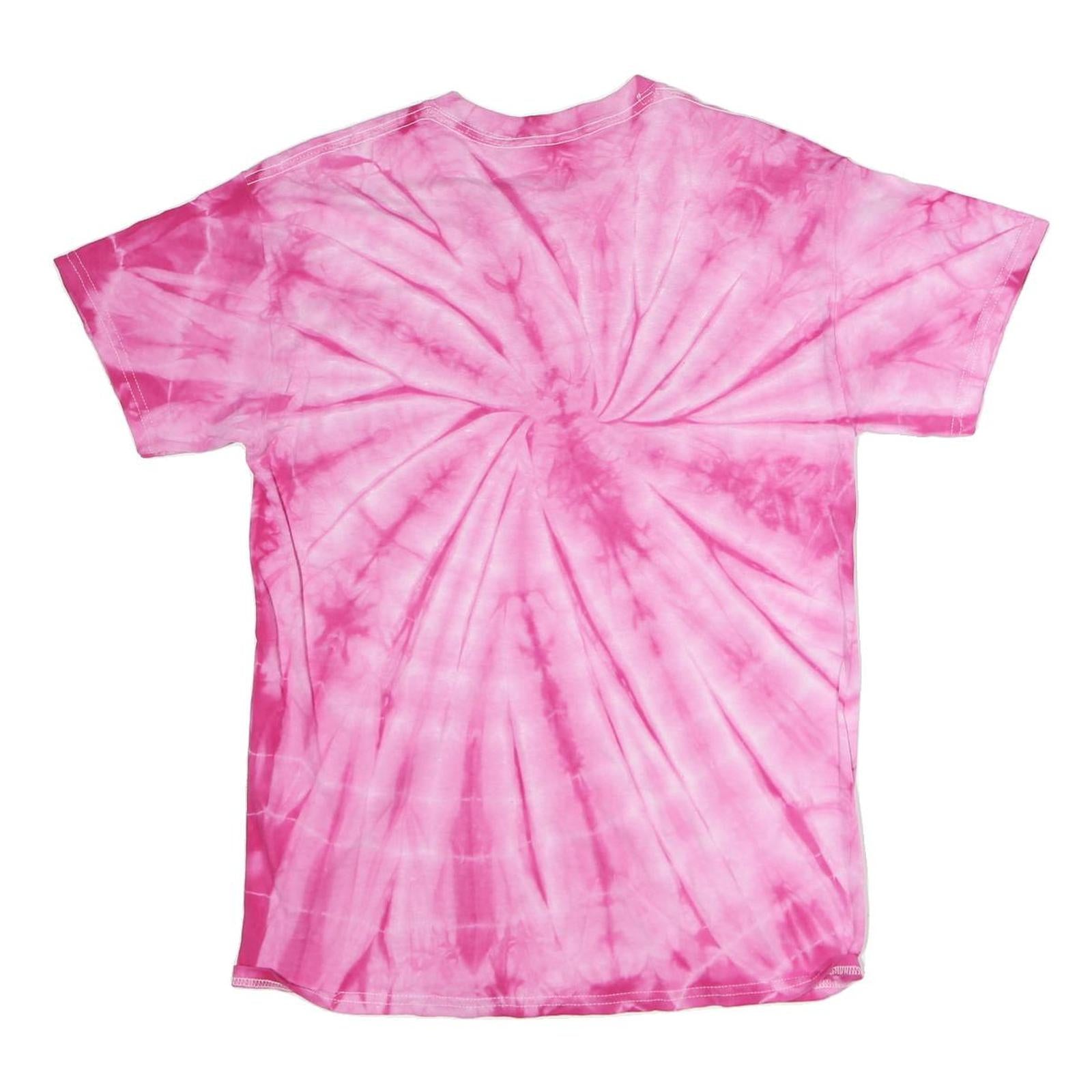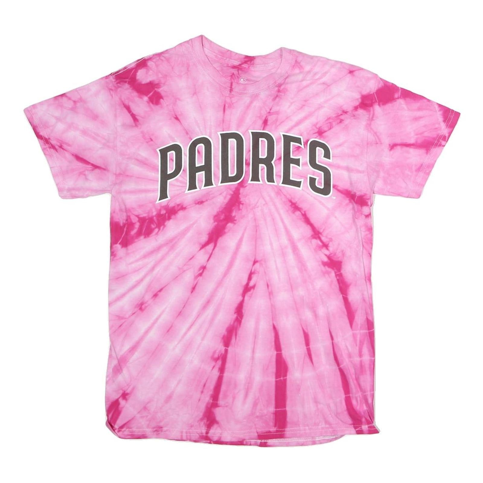 This Genuine Merchandise womens T-Shirt features a vibrant pink tie dye design that radiates from the centre, creating a striking spiral effect. The word "PADRES" is boldly printed across the chest in large grey letters with a white outline, offering a sporty and casual look. The classic crew neck and short sleeve design make this tee comfortable and easy to wear.