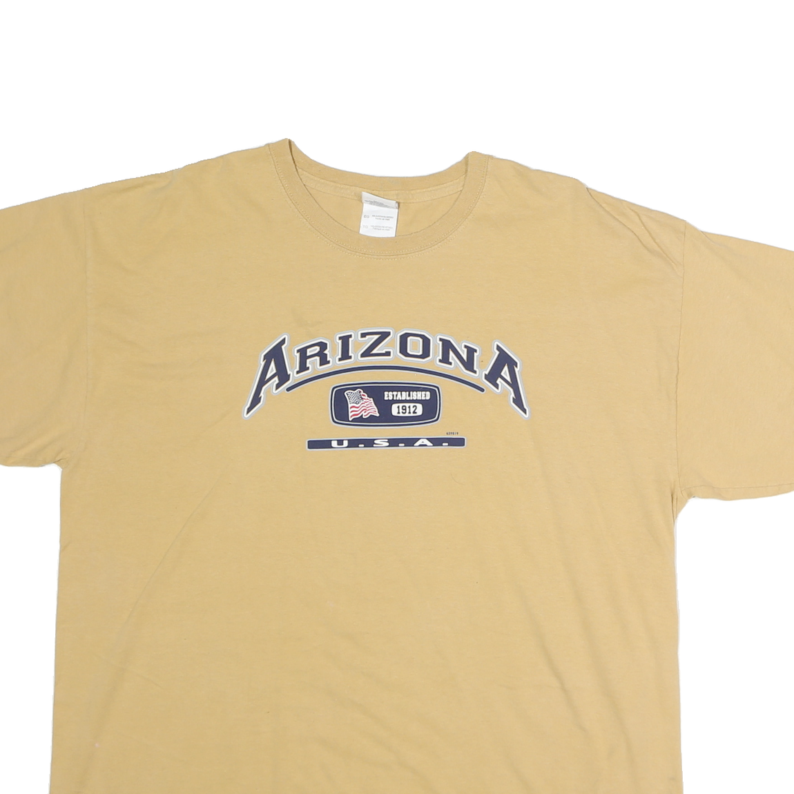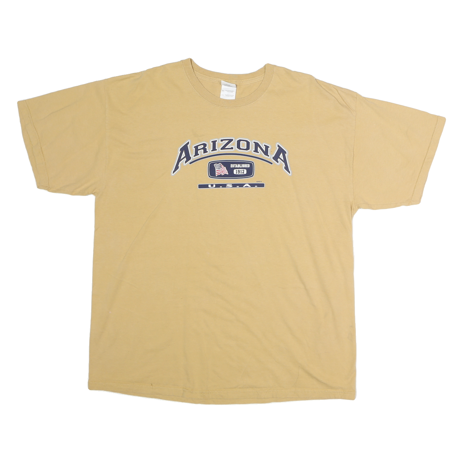 This Mens GILDAN T-shirt comes in a soft beige colour with a central graphic print reading "Arizona U.S.A." along with an established date of 1912 inside a navy and white emblem. The shirt features a classic crew neckline and short sleeves, crafted from comfortable pure cotton fabric.