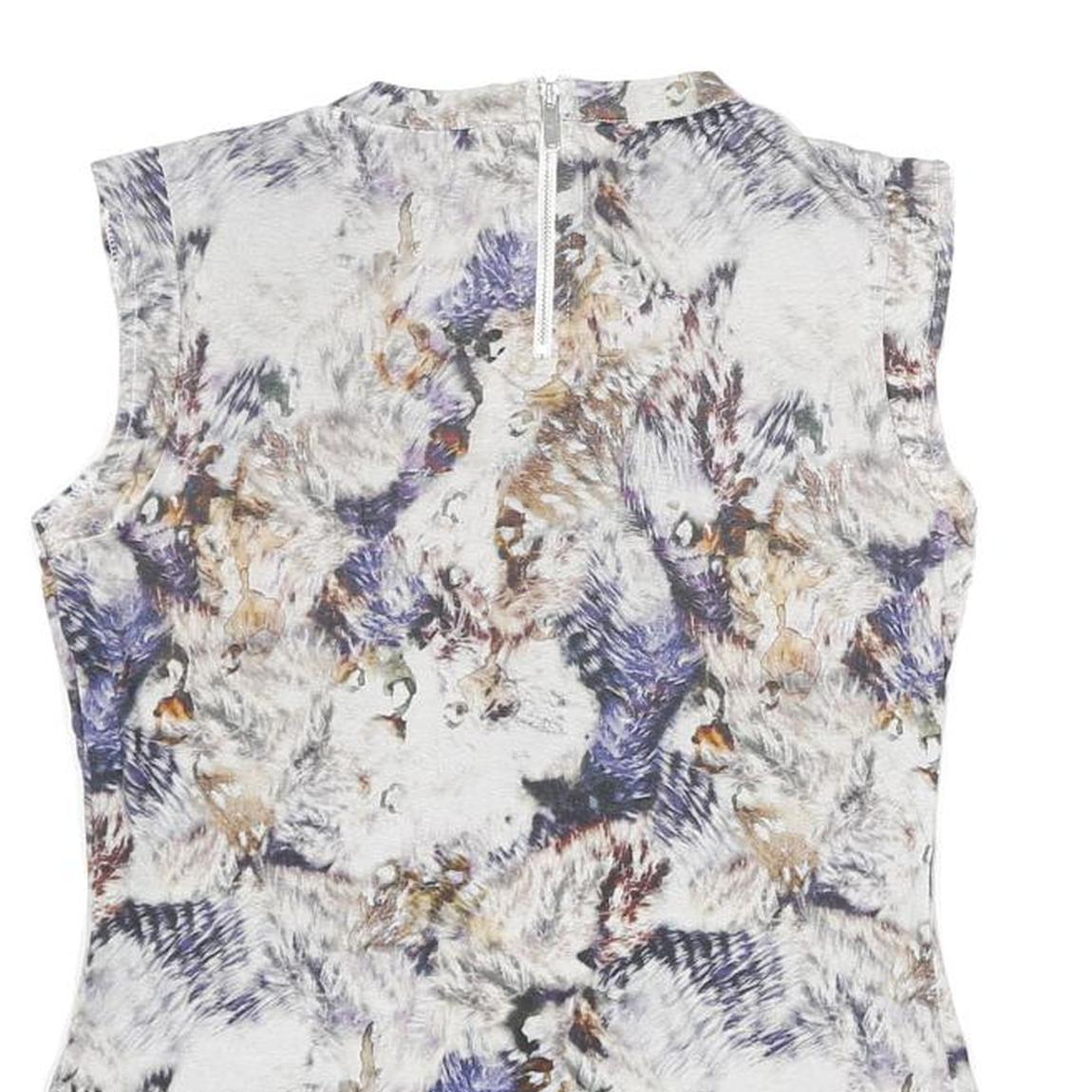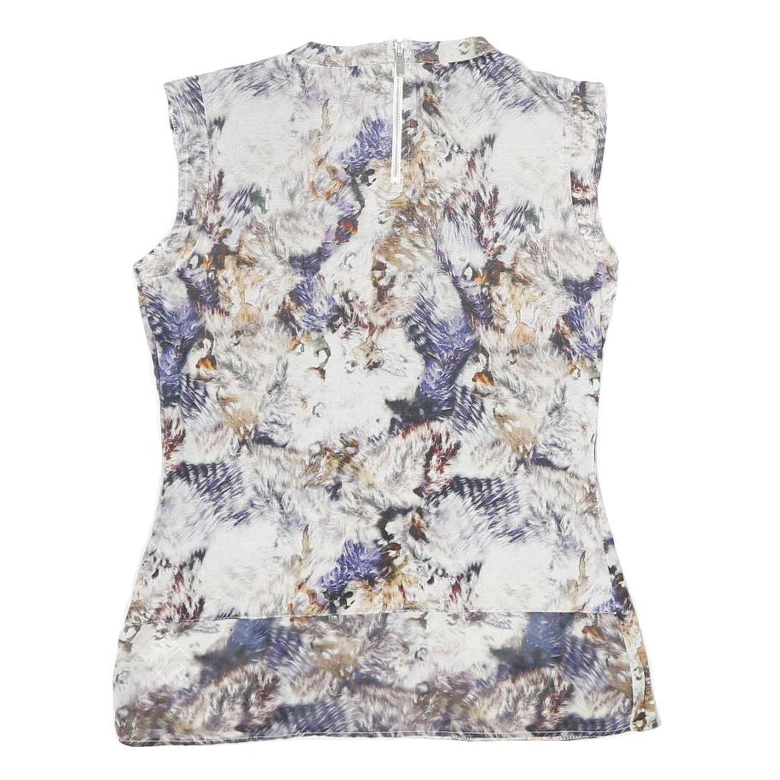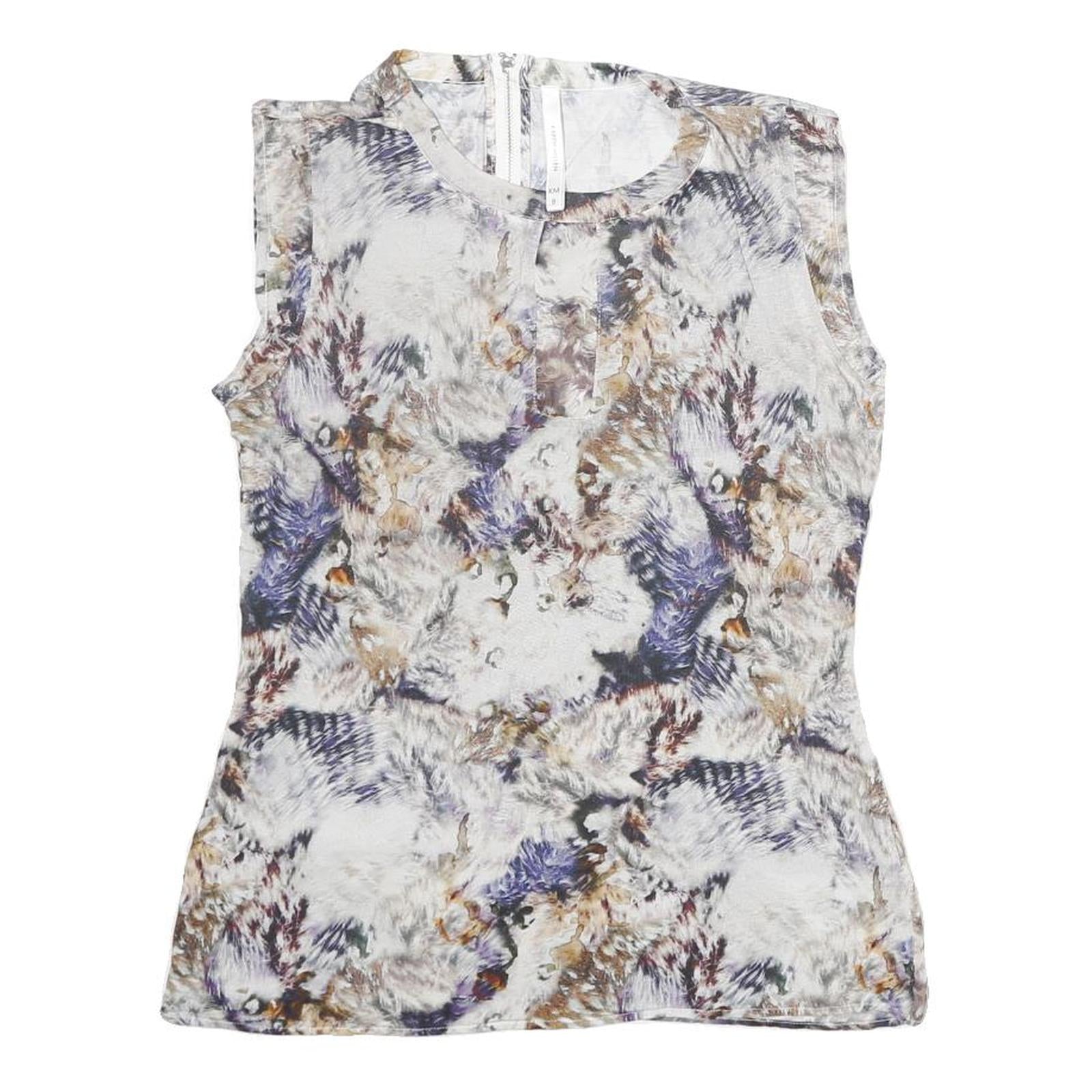 This Karen Millen womens top features a striking abstract print in tones of white, beige, blue, and brown, creating a soft yet visually engaging pattern. The sleeveless design and round neckline make it a stylish and versatile piece, perfect for layering or wearing solo.
