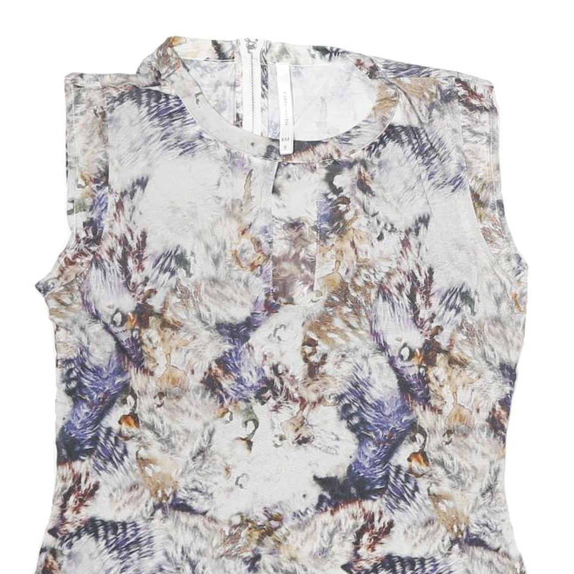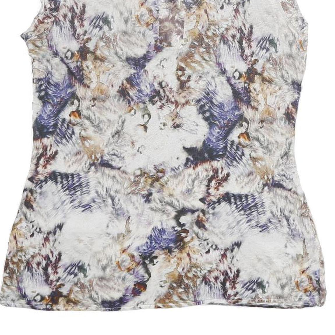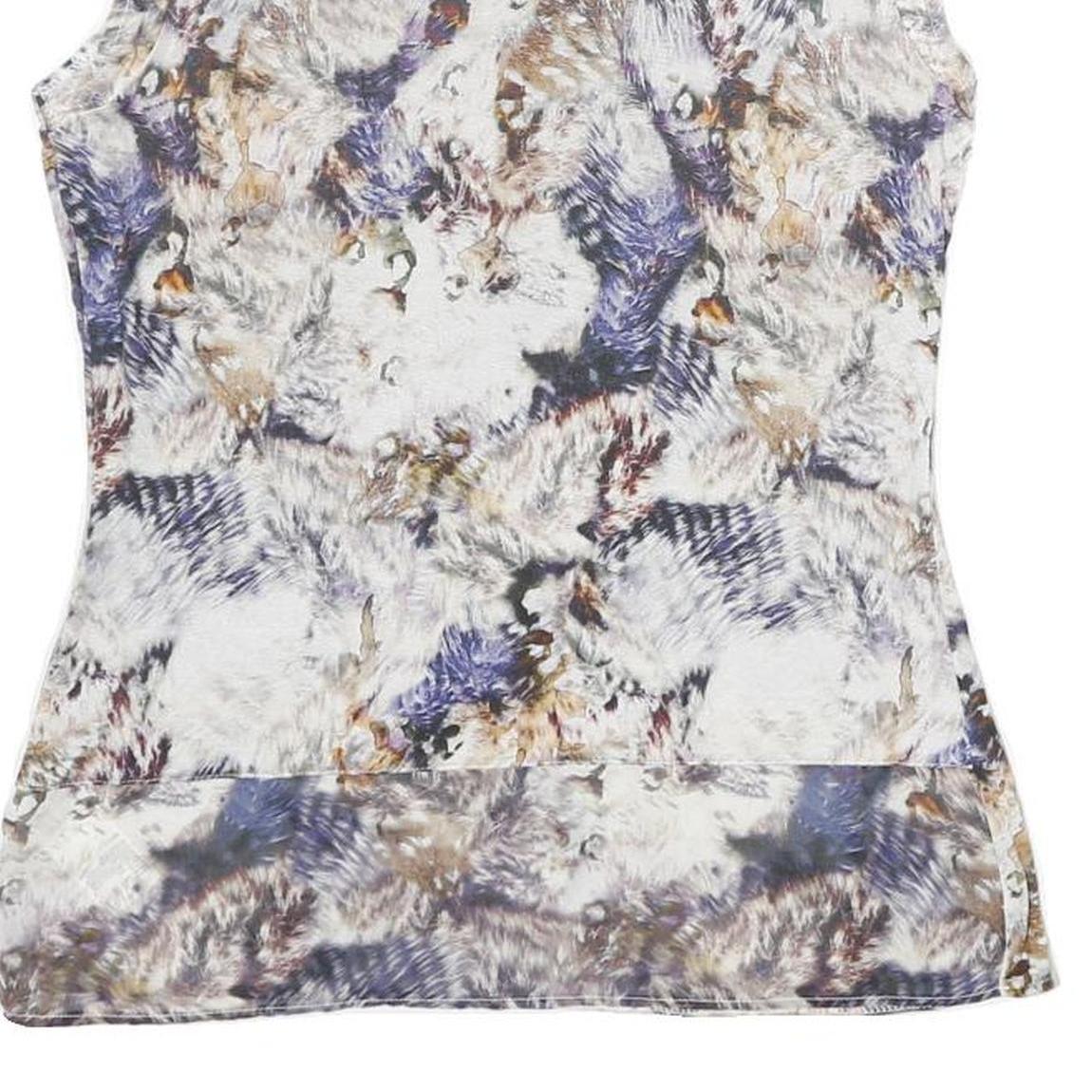 This Karen Millen womens top features a striking abstract print in tones of white, beige, blue, and brown, creating a soft yet visually engaging pattern. The sleeveless design and round neckline make it a stylish and versatile piece, perfect for layering or wearing solo.