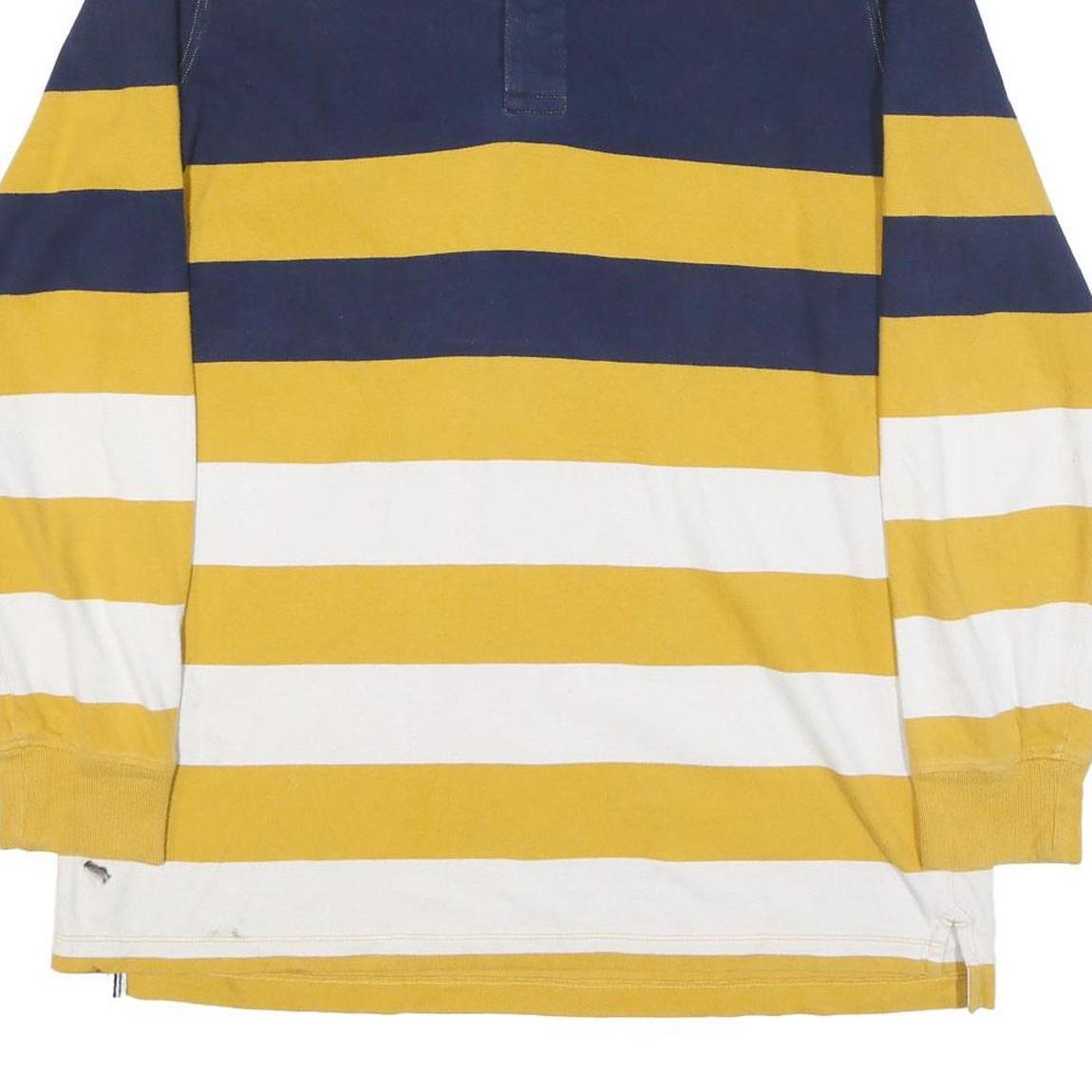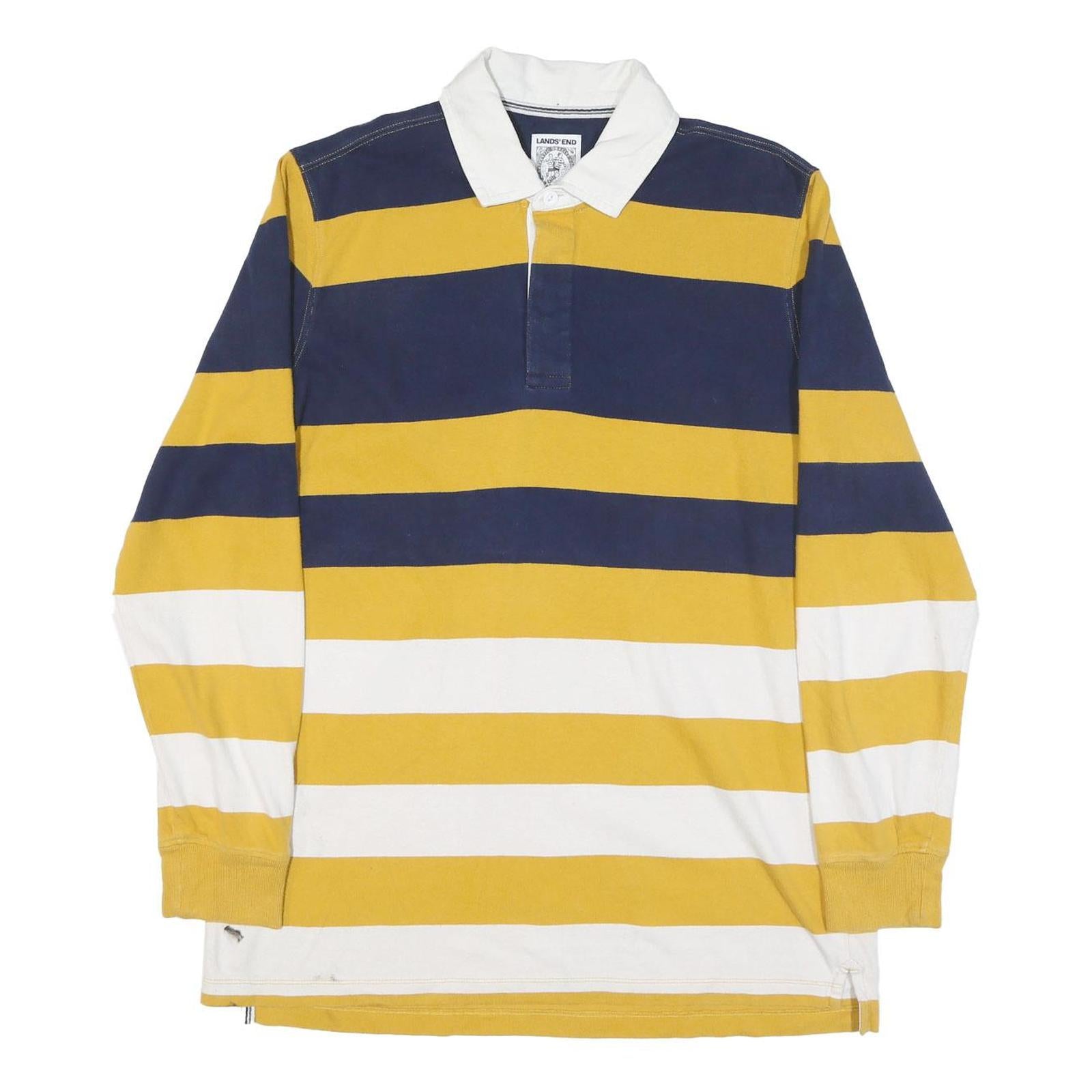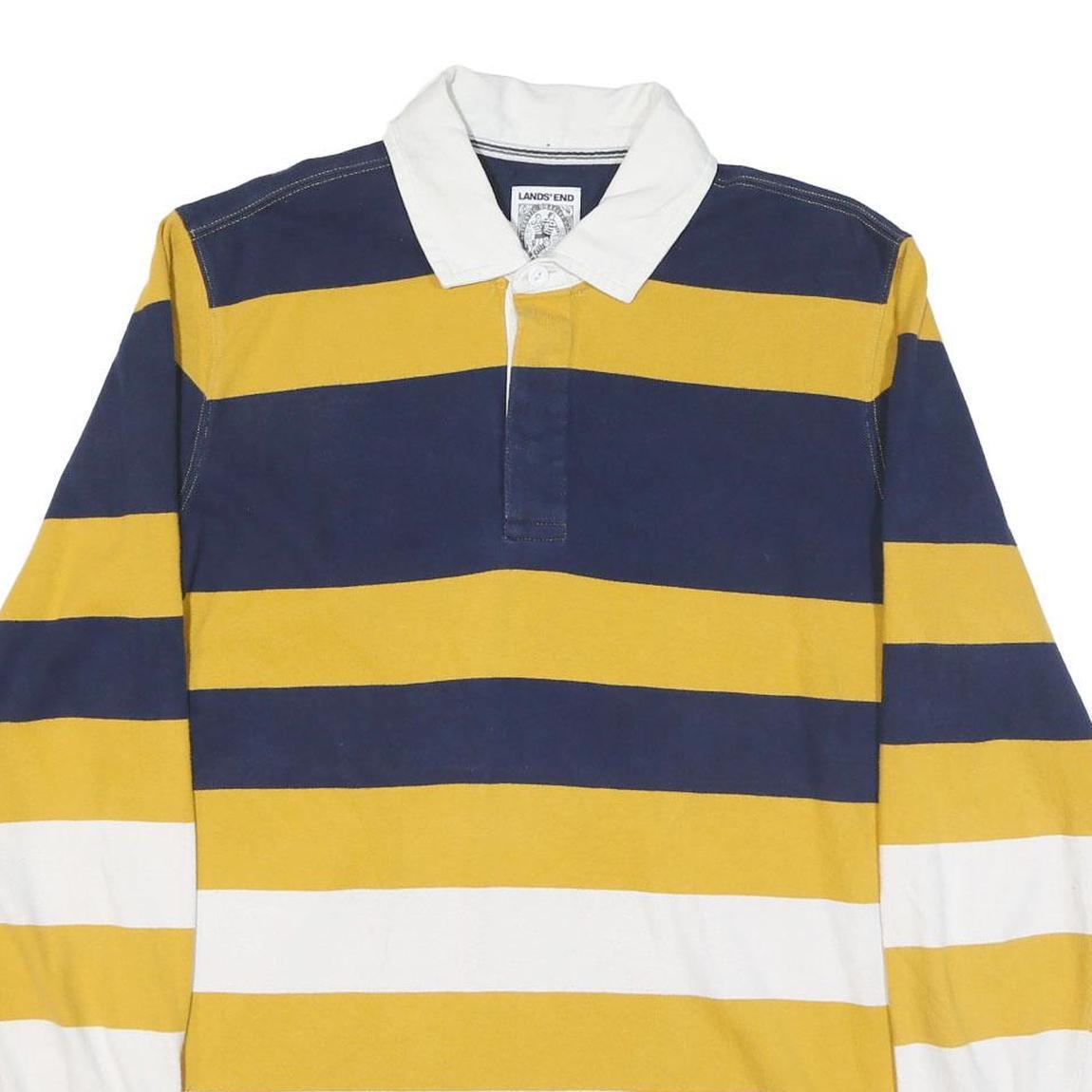 This LANDS END mens polo shirt features bold horizontal stripes in navy blue, golden yellow, and white with a contrasting white collar for a classic and sporty look. The long sleeves include ribbed cuffs, adding to its comfortable and casual style.