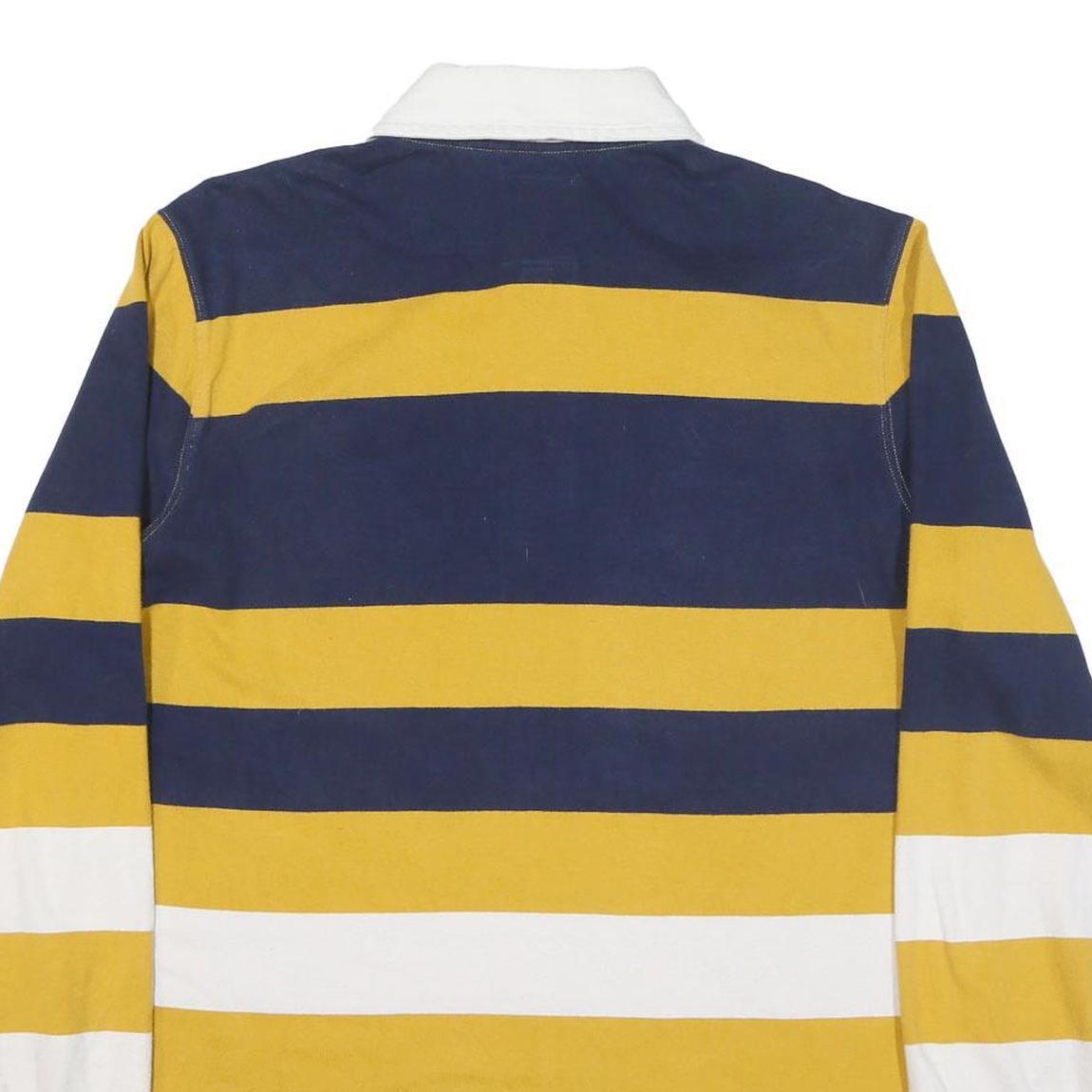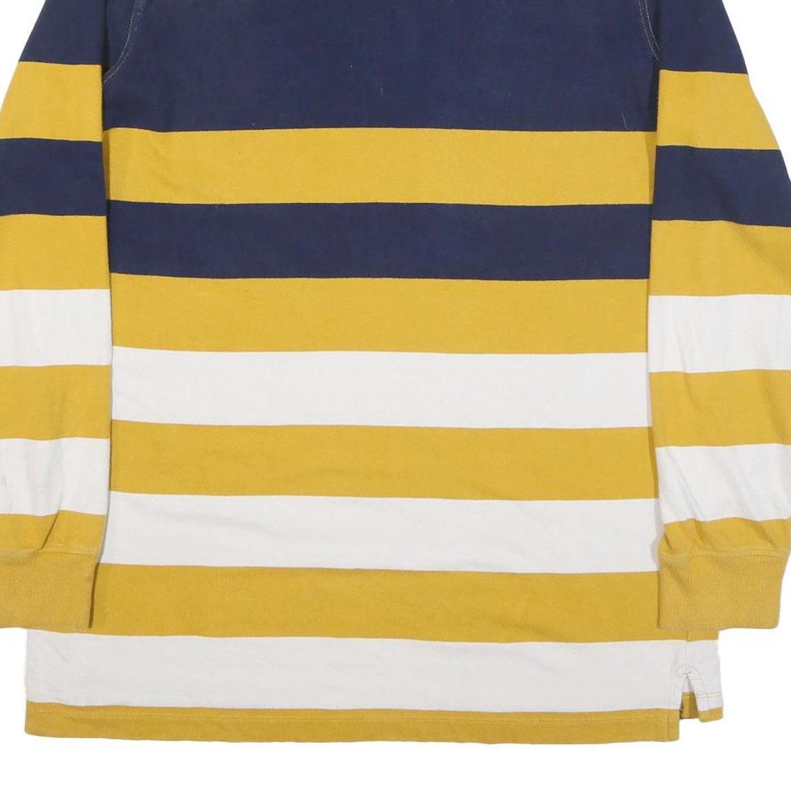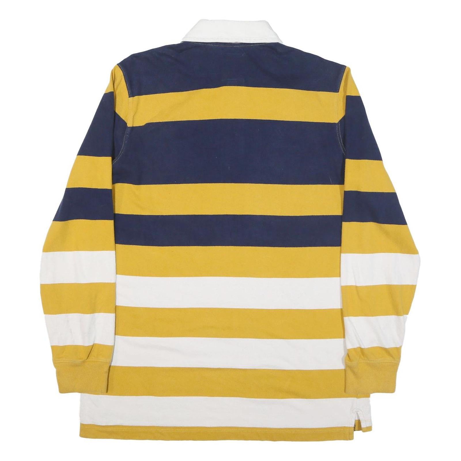 This LANDS END mens polo shirt features bold horizontal stripes in navy blue, golden yellow, and white with a contrasting white collar for a classic and sporty look. The long sleeves include ribbed cuffs, adding to its comfortable and casual style.