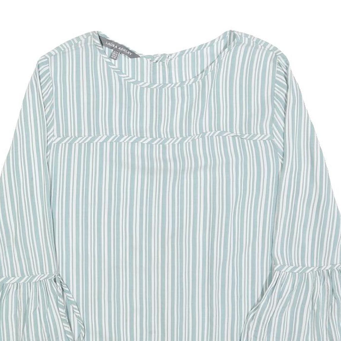 This Laura Ashley blouse features a soft blue and white vertical stripe pattern throughout the garment, creating a classic and fresh look. The material is a comfortable cotton blend, providing a lightweight and breathable feel against the skin.