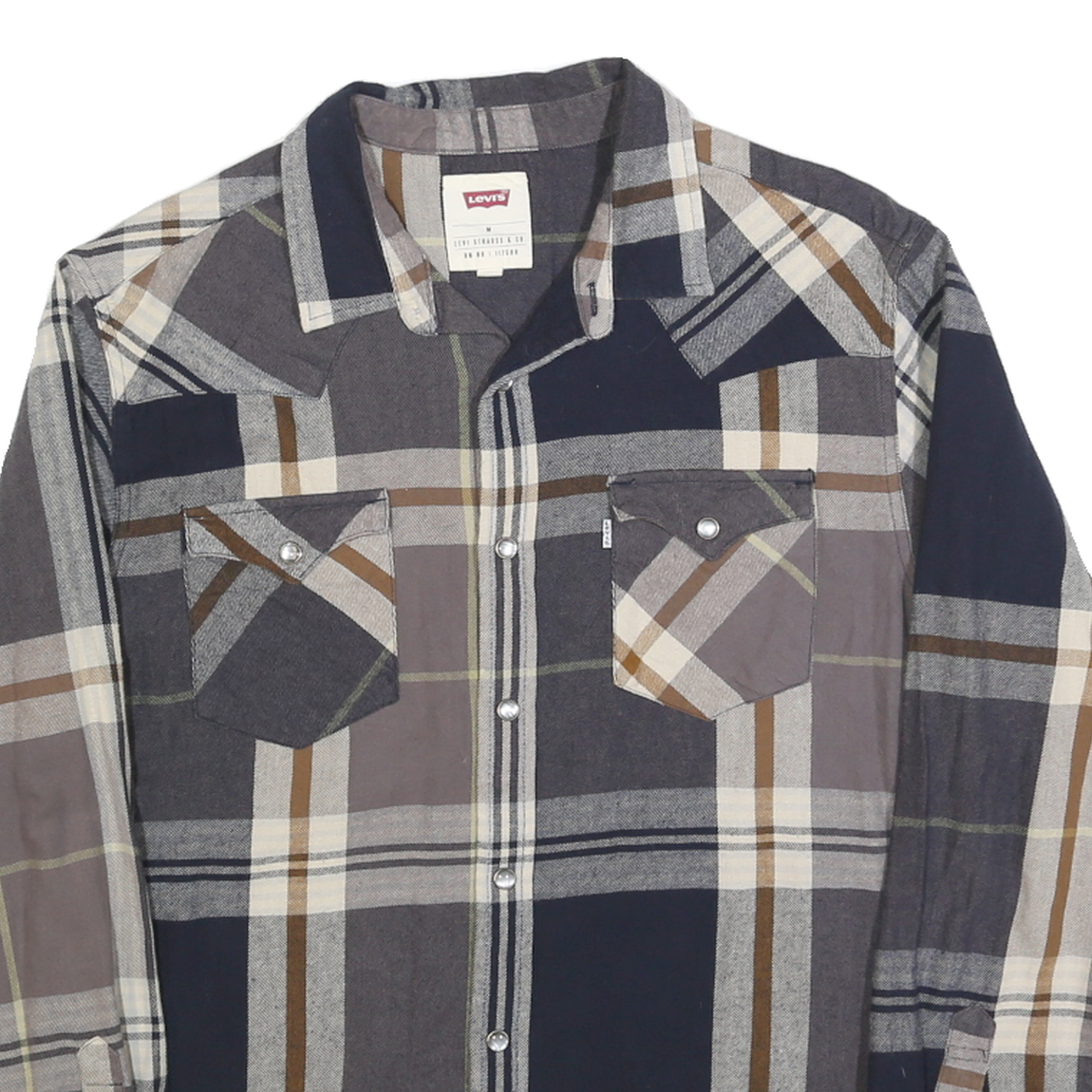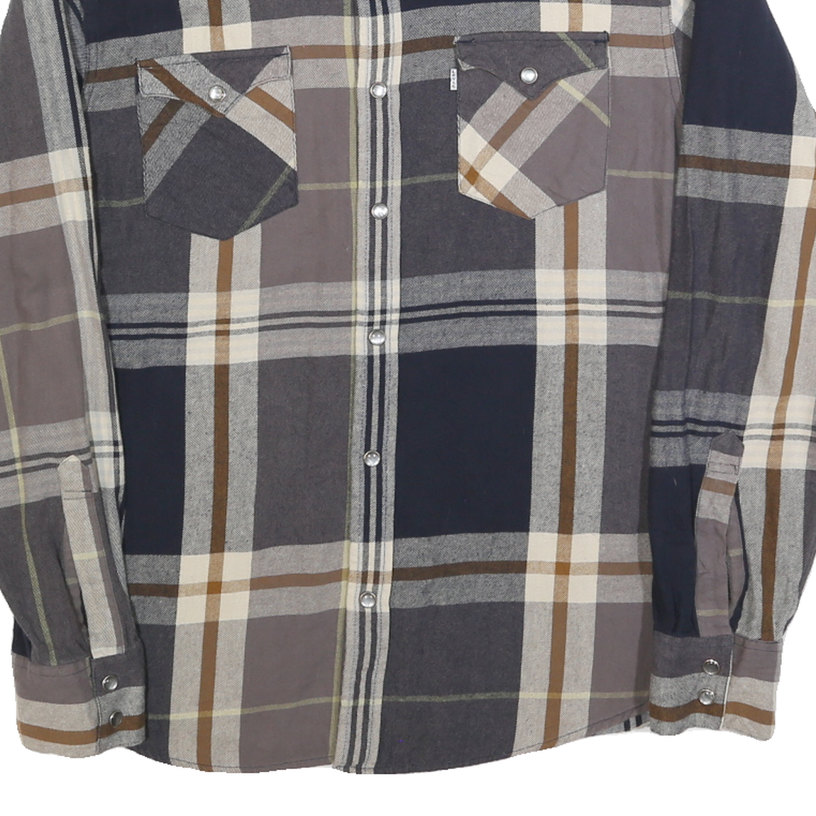 This Levi's mens shirt features a large checked pattern in shades of blue, brown, grey, and cream. It has a classic button-down front with silver-tone snap buttons and two front chest pockets with flaps and snaps. The shirt collar is a traditional point style, complementing the casual yet stylish aesthetic.
