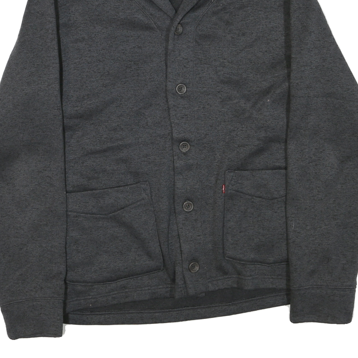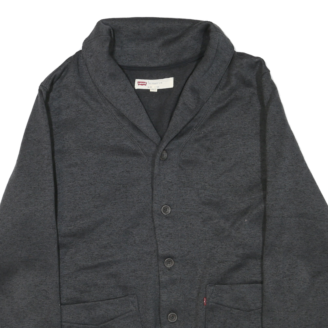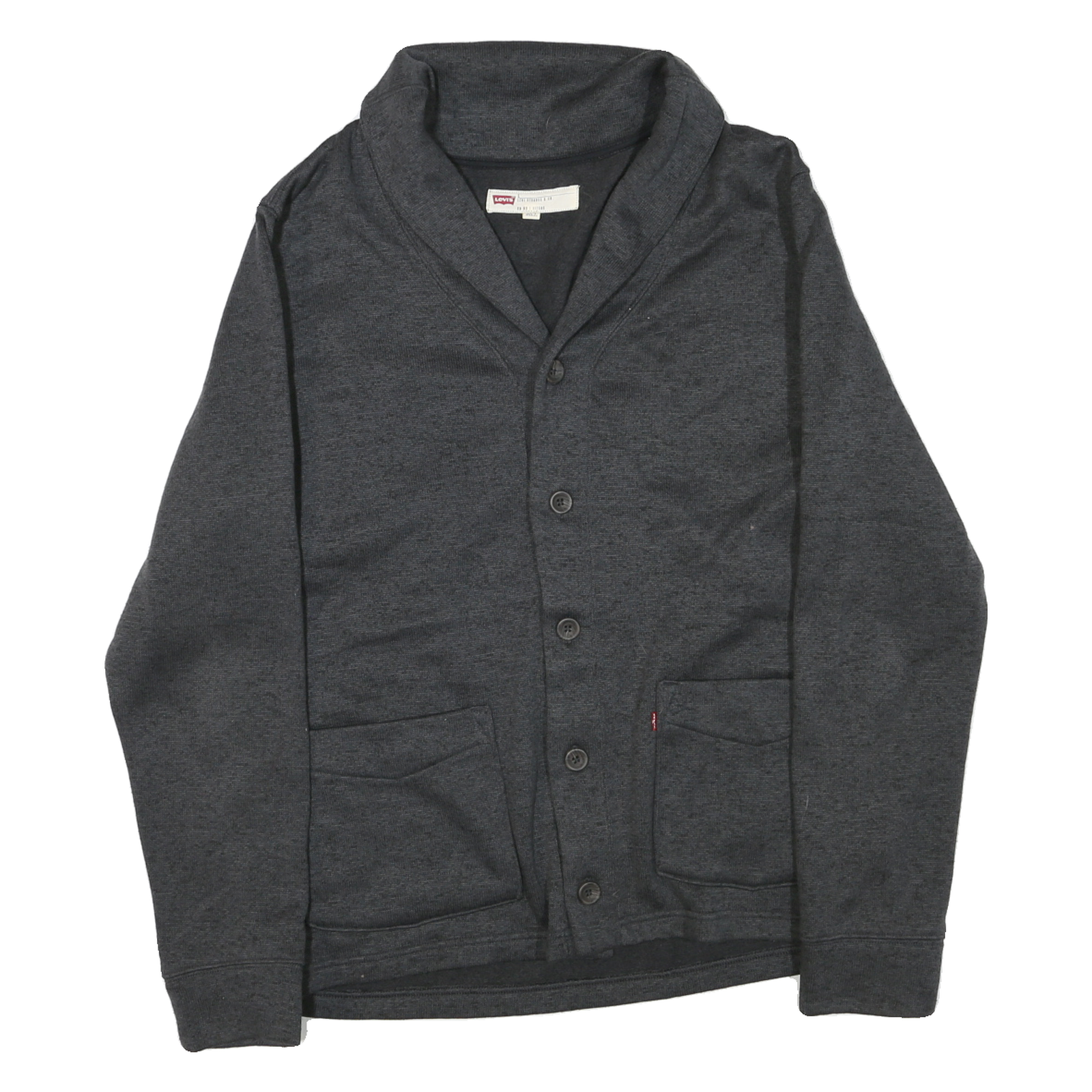 This Levi's mens jacket showcases a classic grey colour with a distinctive shawl collar and a full button-up front closure. It features two angled front pockets with subtle angular detailing and a small Levi's red tag for authentic branding. The material exhibits a smooth polyester blend, giving it a soft yet sturdy texture ideal for cool weather.