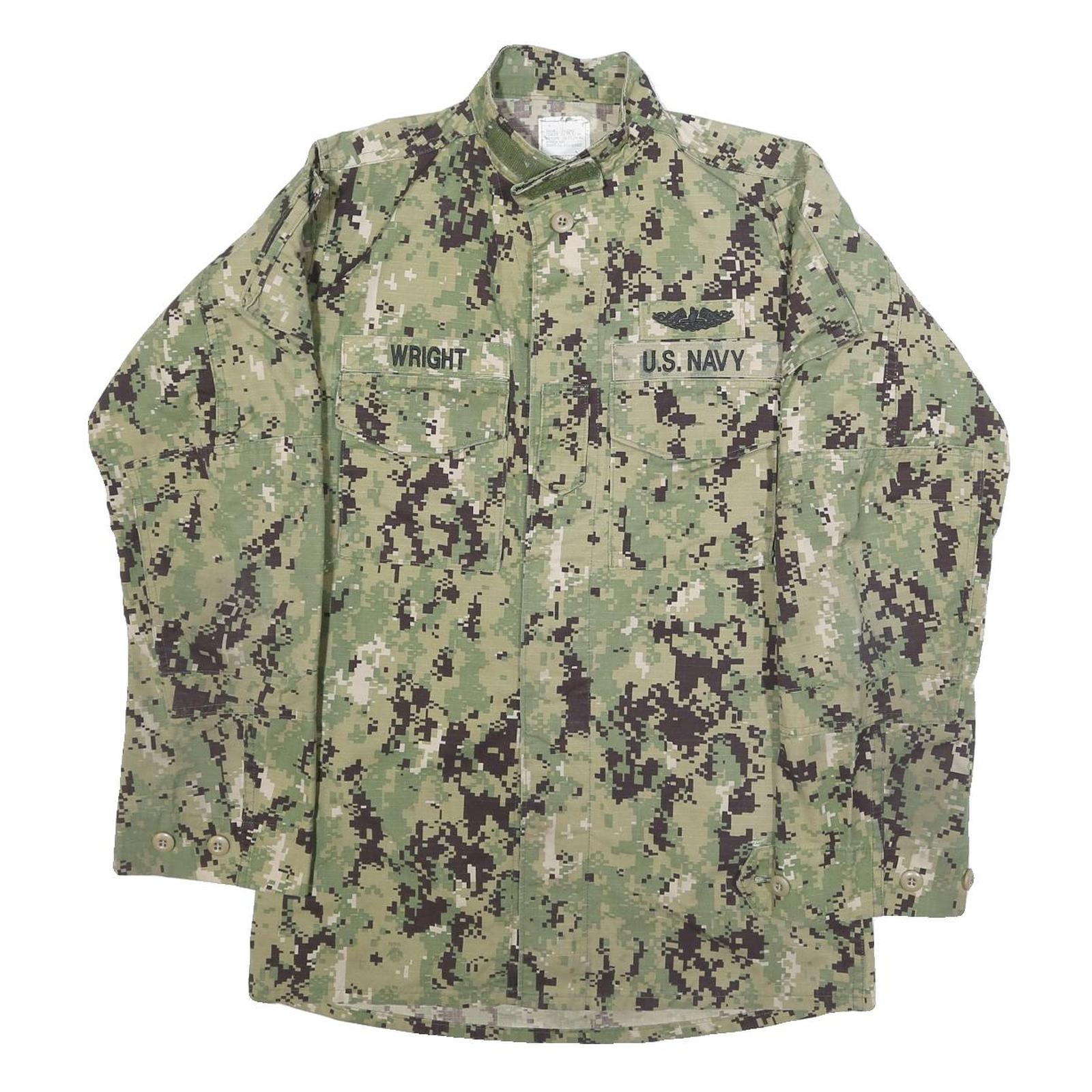 This M&M Manufacturing mens jacket features a green digital camouflage pattern with pixelated shades of green, black, and beige. It has two front chest pockets with flaps, one embroidered with "U.S. Navy" and the other with the name "Wright", alongside a black insignia. The jacket is designed with a stand-up collar and button closure.