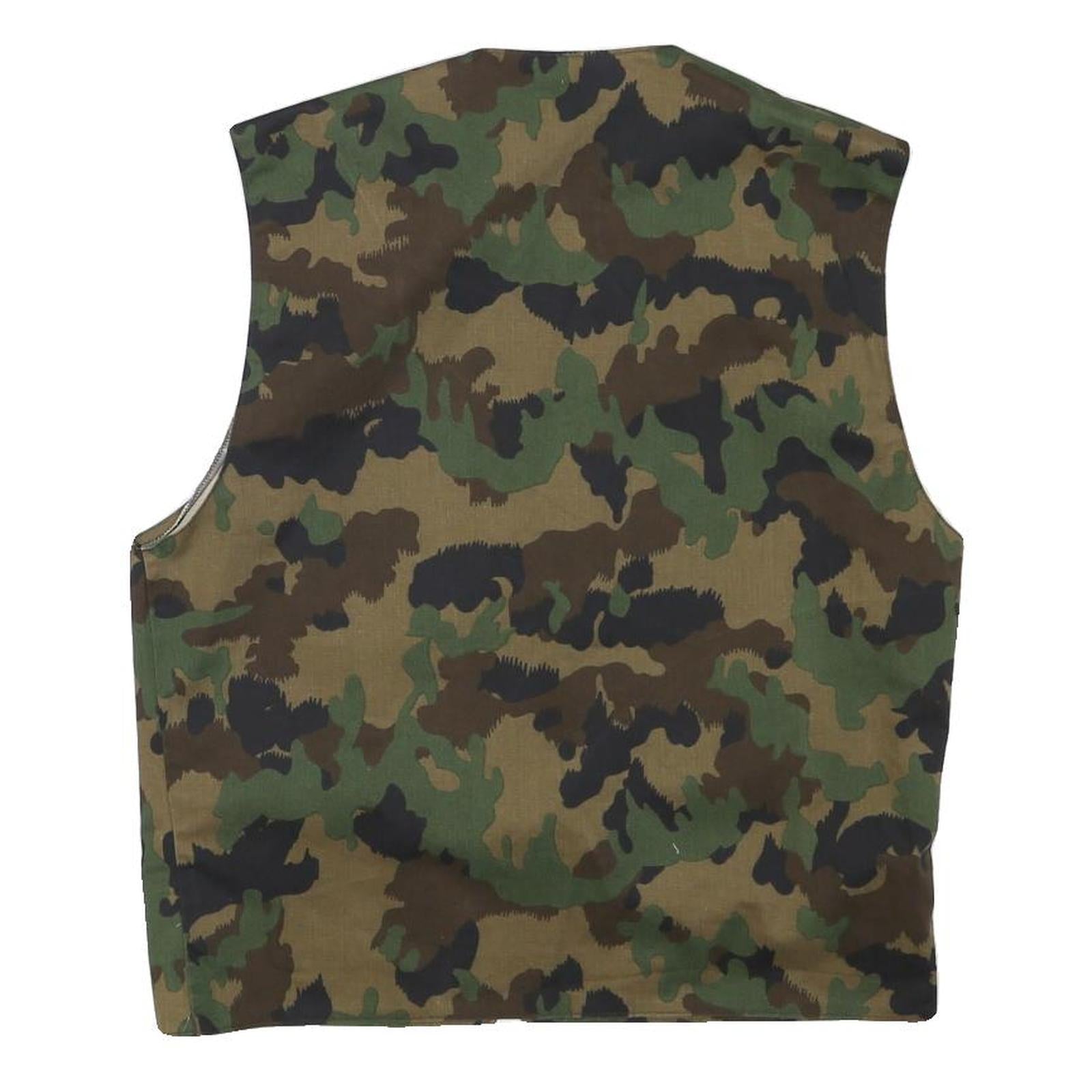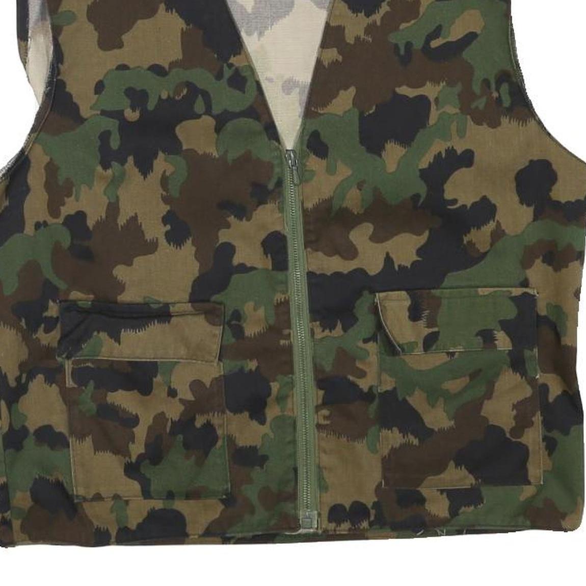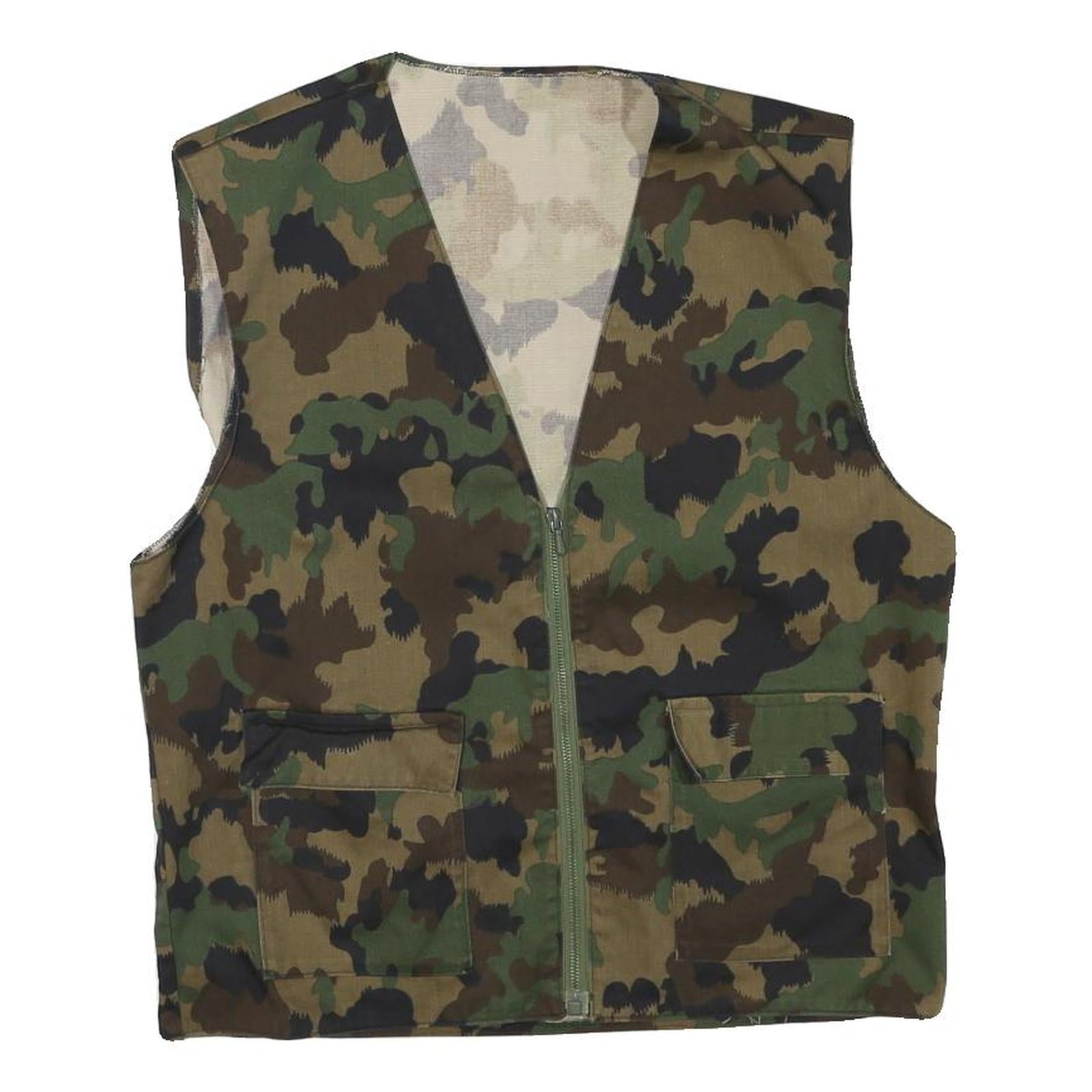 This mens jacket features a classic camouflage print in shades of green, brown, and black, providing a rugged and versatile look. It is sleeveless with a central zip closure and two front patch pockets, ideal for practical use.