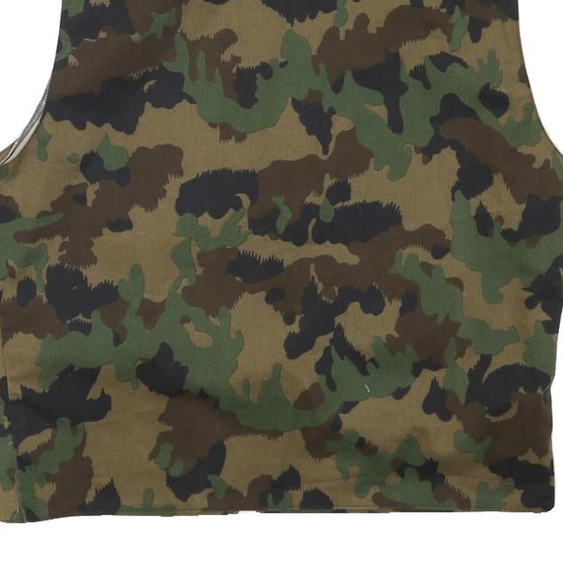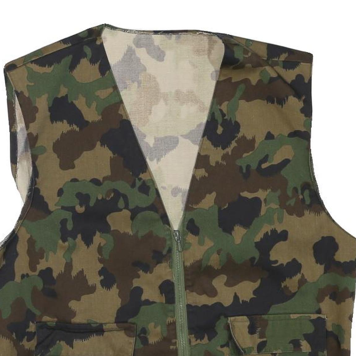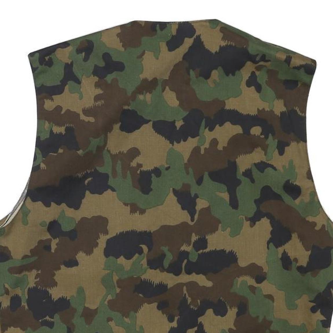This mens jacket features a classic camouflage print in shades of green, brown, and black, providing a rugged and versatile look. It is sleeveless with a central zip closure and two front patch pockets, ideal for practical use.