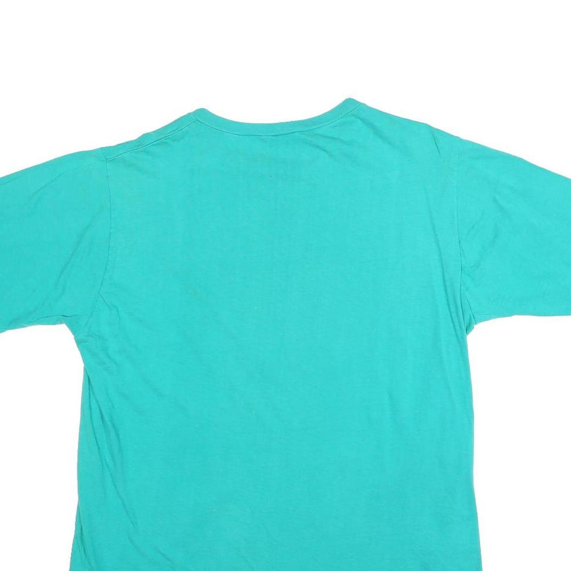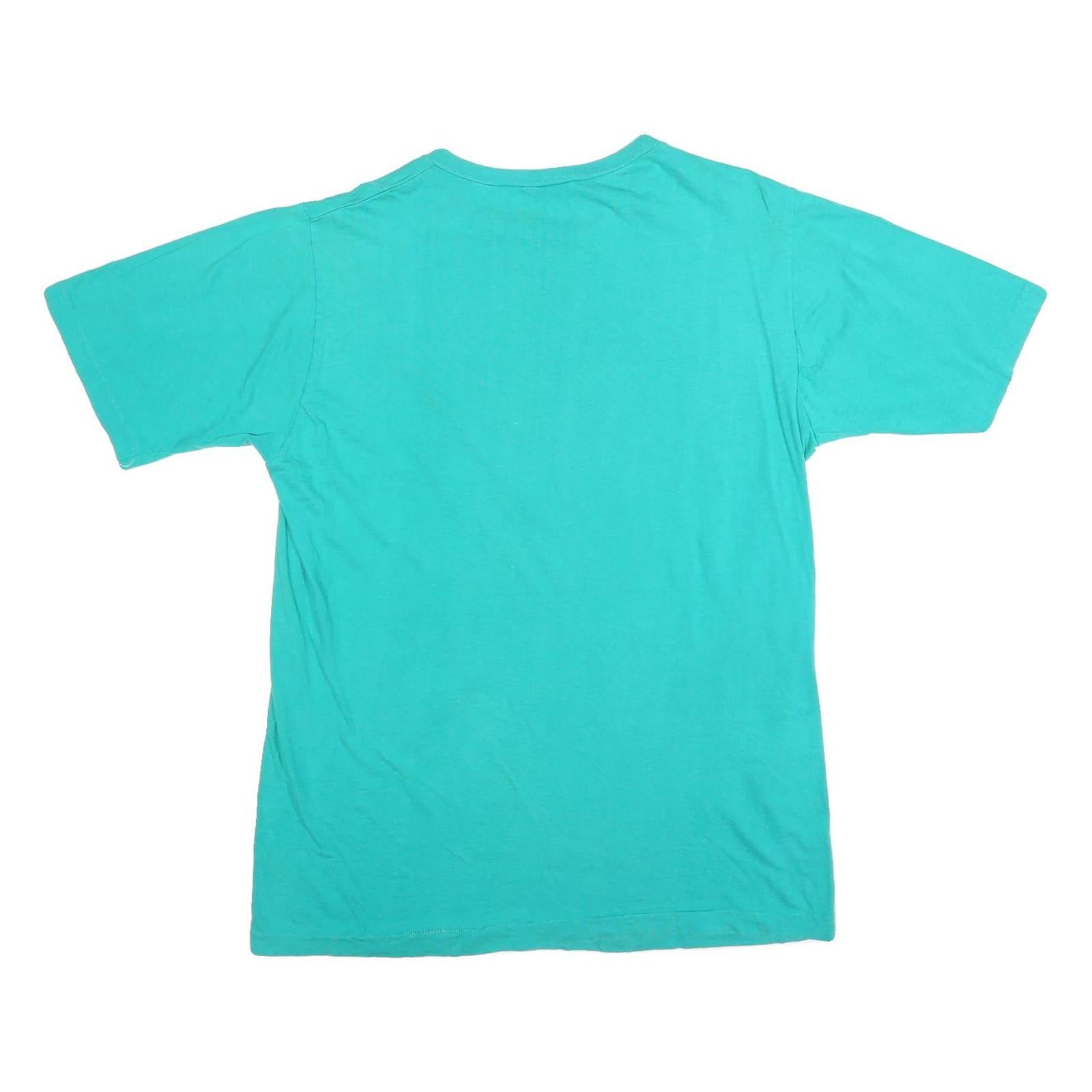 This mens turquoise T-shirt showcases a prominent graphic on the front celebrating the 1989 Grey Cup Champions, Saskatchewan Roughriders. The design includes bold text and an illustration of a football helmet, giving it a vintage sports vibe. The rear of the T-shirt is plain turquoise, allowing the focus on the front print.