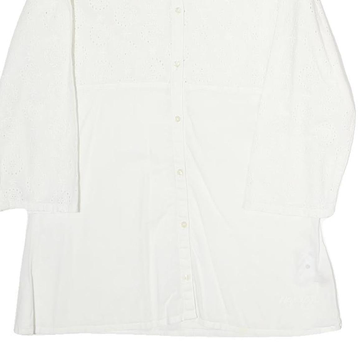 This womens top from NAPAJIRI is crafted in a soft white cotton blend fabric, offering both comfort and breathability. The upper bodice and sleeves feature an elegant eyelet embroidery pattern that adds a delicate textured detail. It fastens at the front with a row of small buttons, extending from neckline to hem.