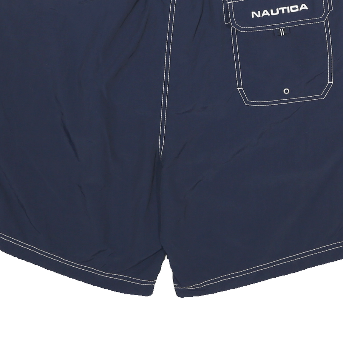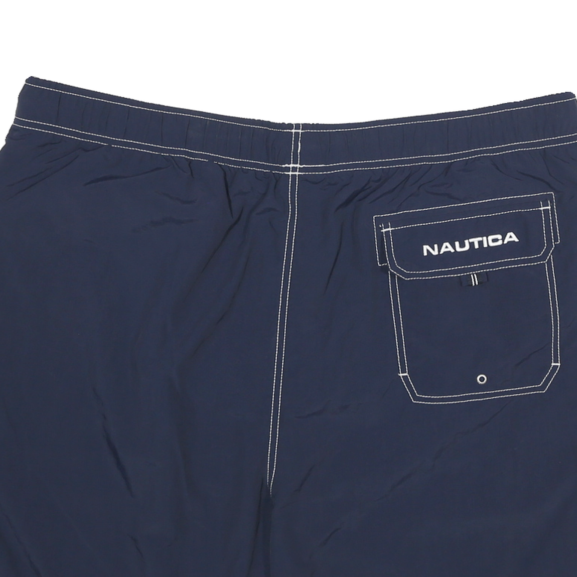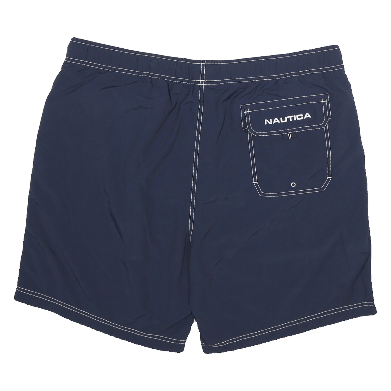 These NAUTICA mens shorts come in a deep navy blue accented with contrasting white stitching and a branded logo detail at the bottom front. They feature a drawstring waistband for an adjustable fit and a back pocket with a flap and printed NAUTICA logo for secure storage.