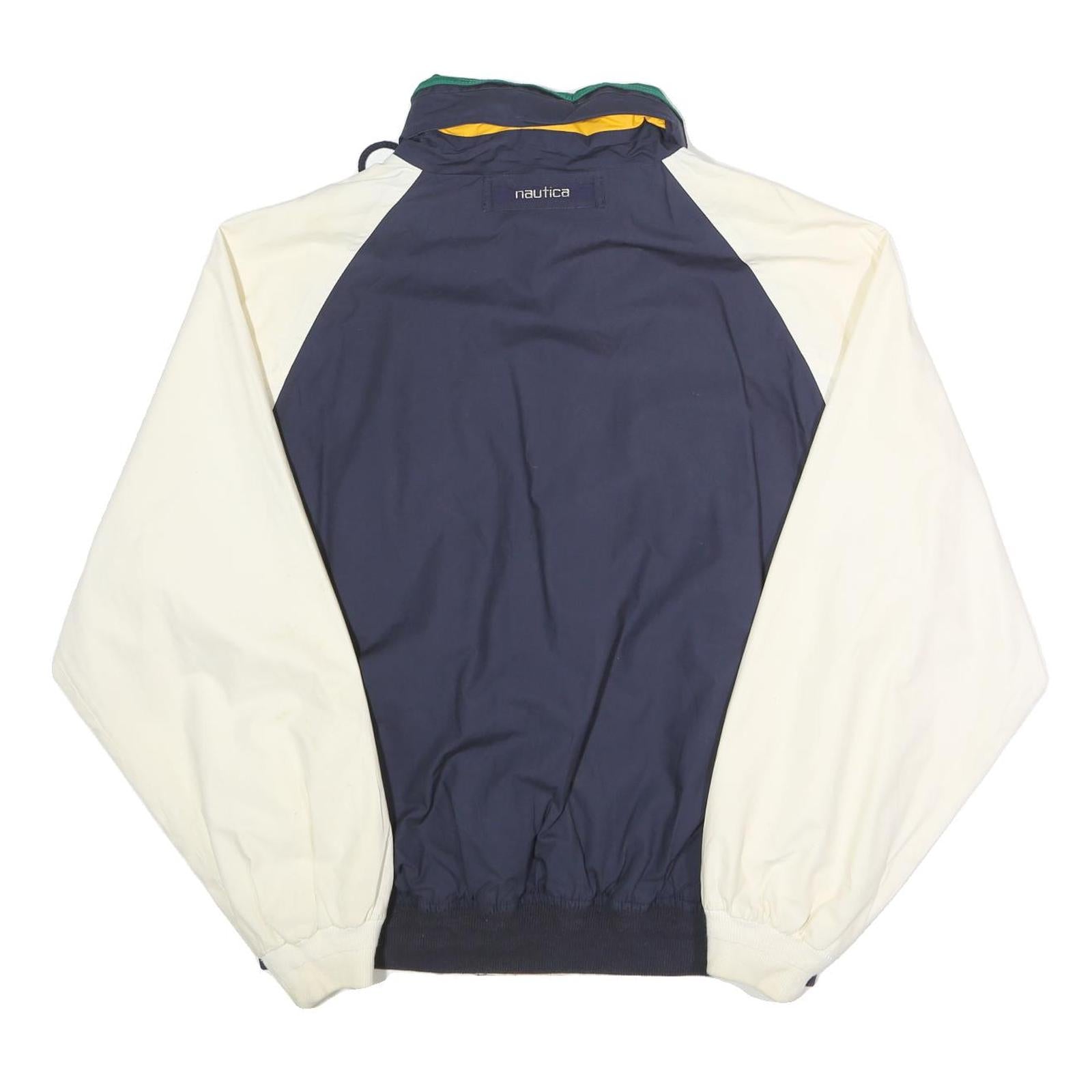 This Nautica mens jacket features a navy body with cream sleeves and green detailing inside the pockets and collar. The jacket has a zip closure with additional snap buttons at the hem for a secure fit. The high collar includes a drawstring for adjustable comfort and protection against the elements.
