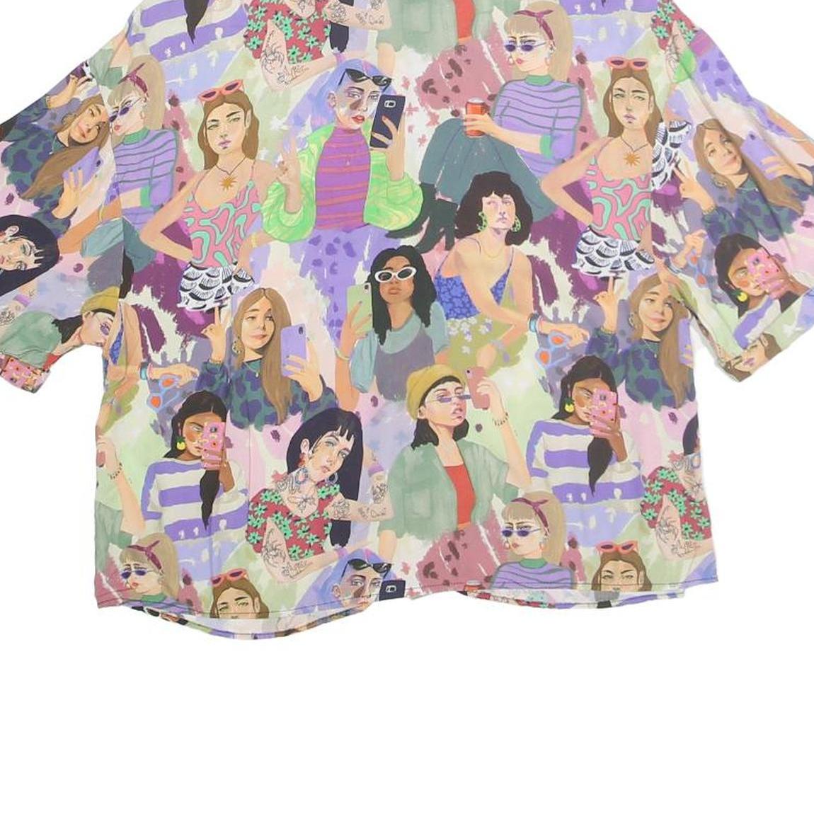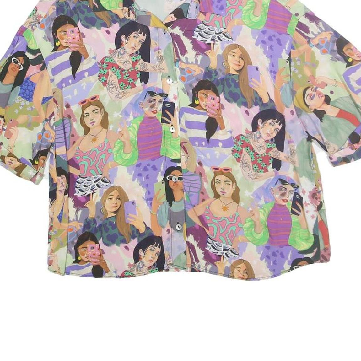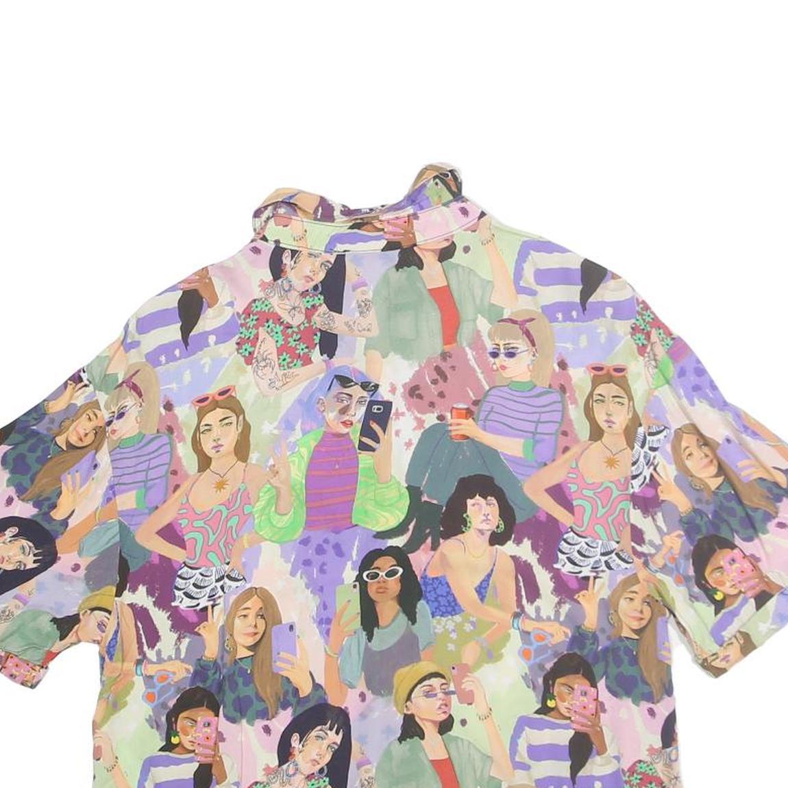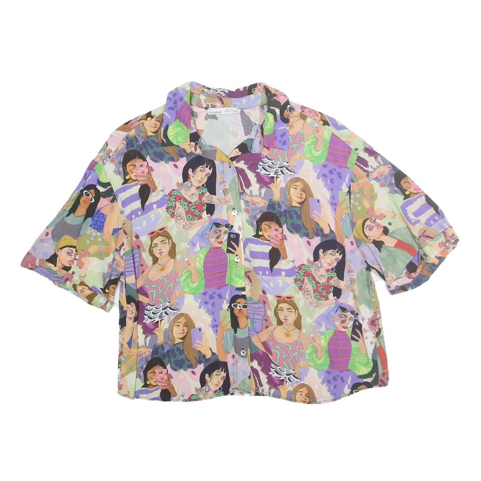 This PULL & BEAR womens top features an all-over colourful print showcasing various illustrated women in different poses and outfits. The vibrant pattern includes shades of purple, green, pink, and other pastel hues, creating a lively and artistic look. It has a classic collared neckline and a button-front closure, paired with short sleeves for a breezy fit.