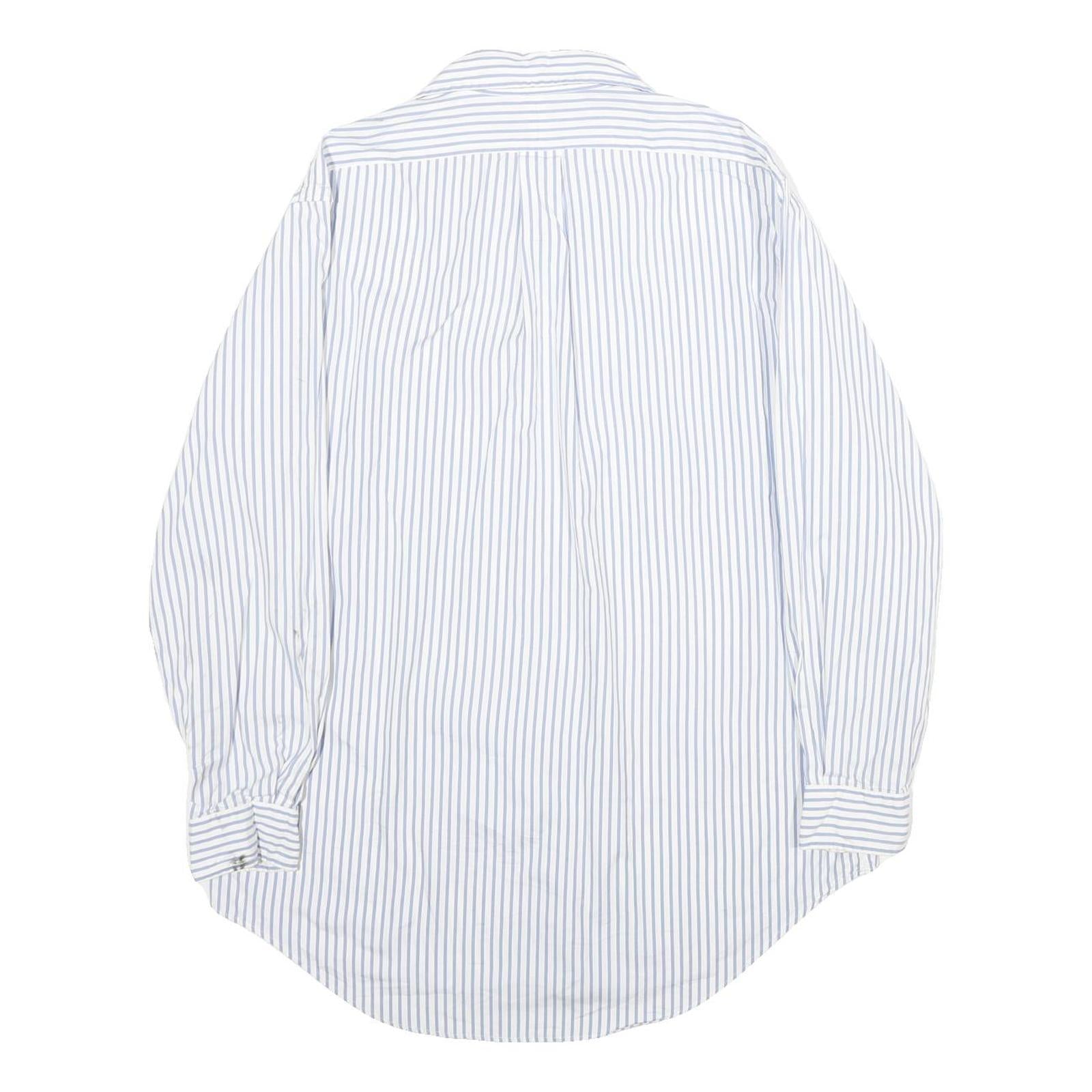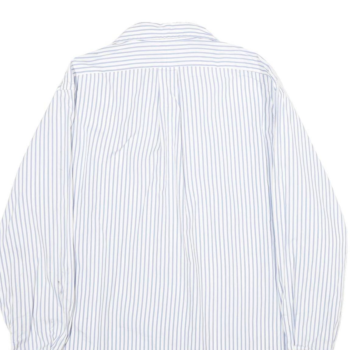 This Ralph Lauren mens shirt features a crisp white base adorned with fine blue vertical stripes for a classic and timeless look. The front showcases the traditional button closure with matching white buttons, while the collar is a neat button-down style enhancing the shirt's sharp appearance. The shirt has long sleeves completed with buttoned cuffs.
