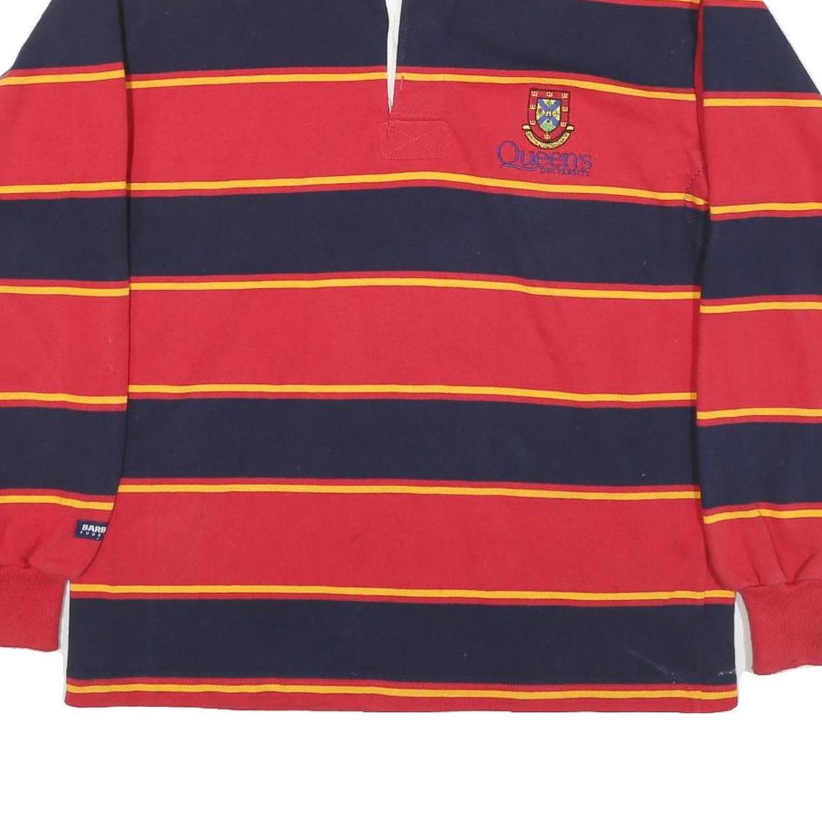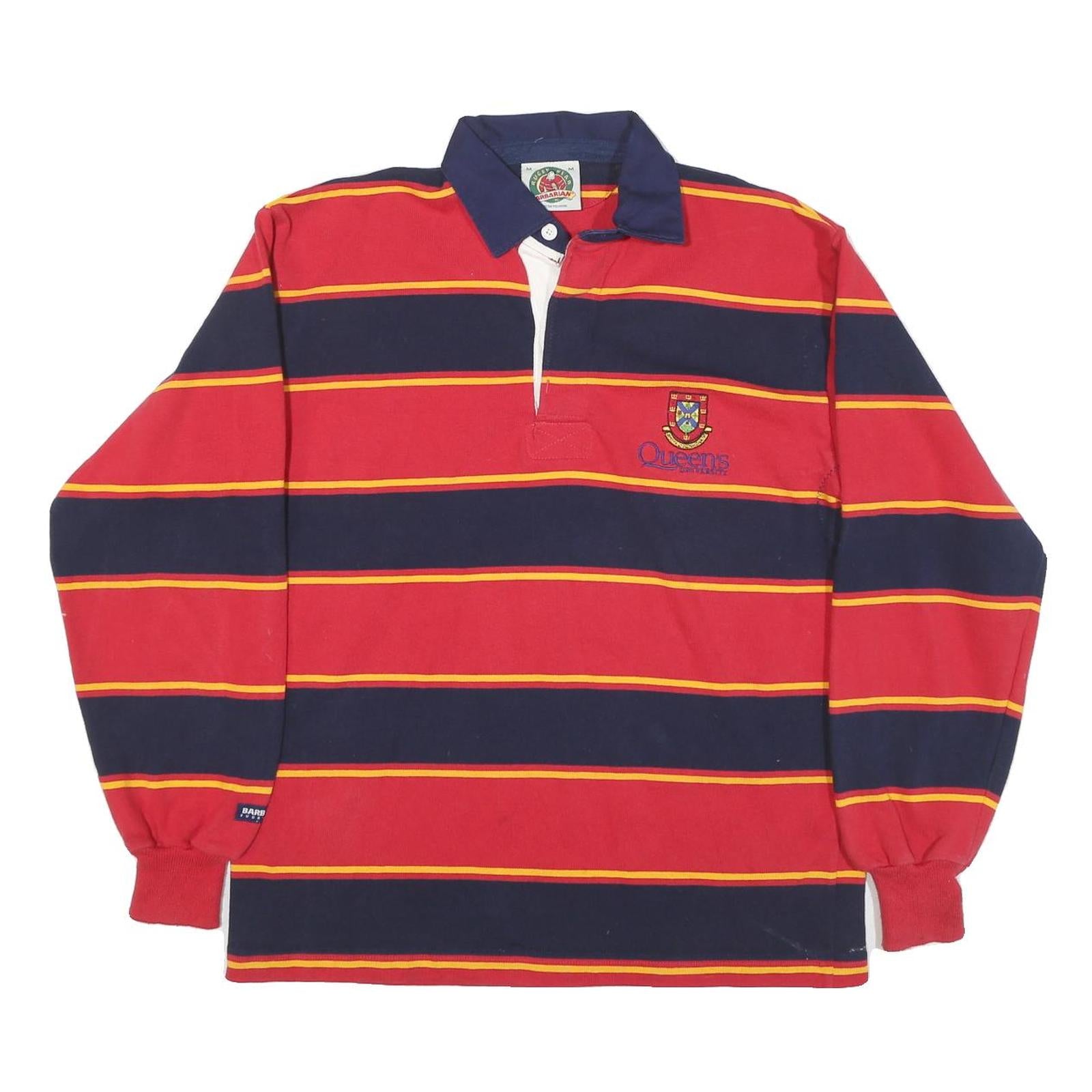 This long sleeve polo shirt from RUGBY WEAR features bold horizontal stripes in red, navy, and yellow tones. The neckline sports a classic navy collar with a white placket, complemented by an embroidered crest and the text "Queens" on the chest area, adding a distinctive rugby-inspired touch. The shirt is crafted from a comfortable cotton blend fabric with ribbed cuffs for a snug fit.