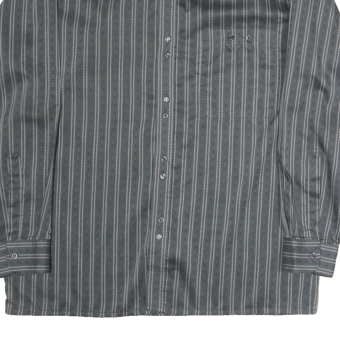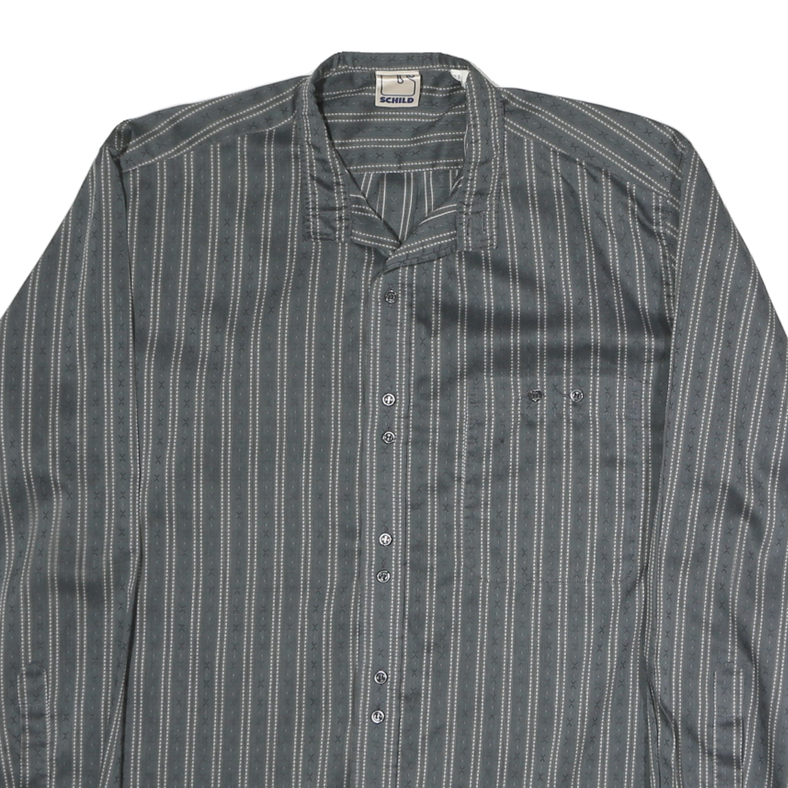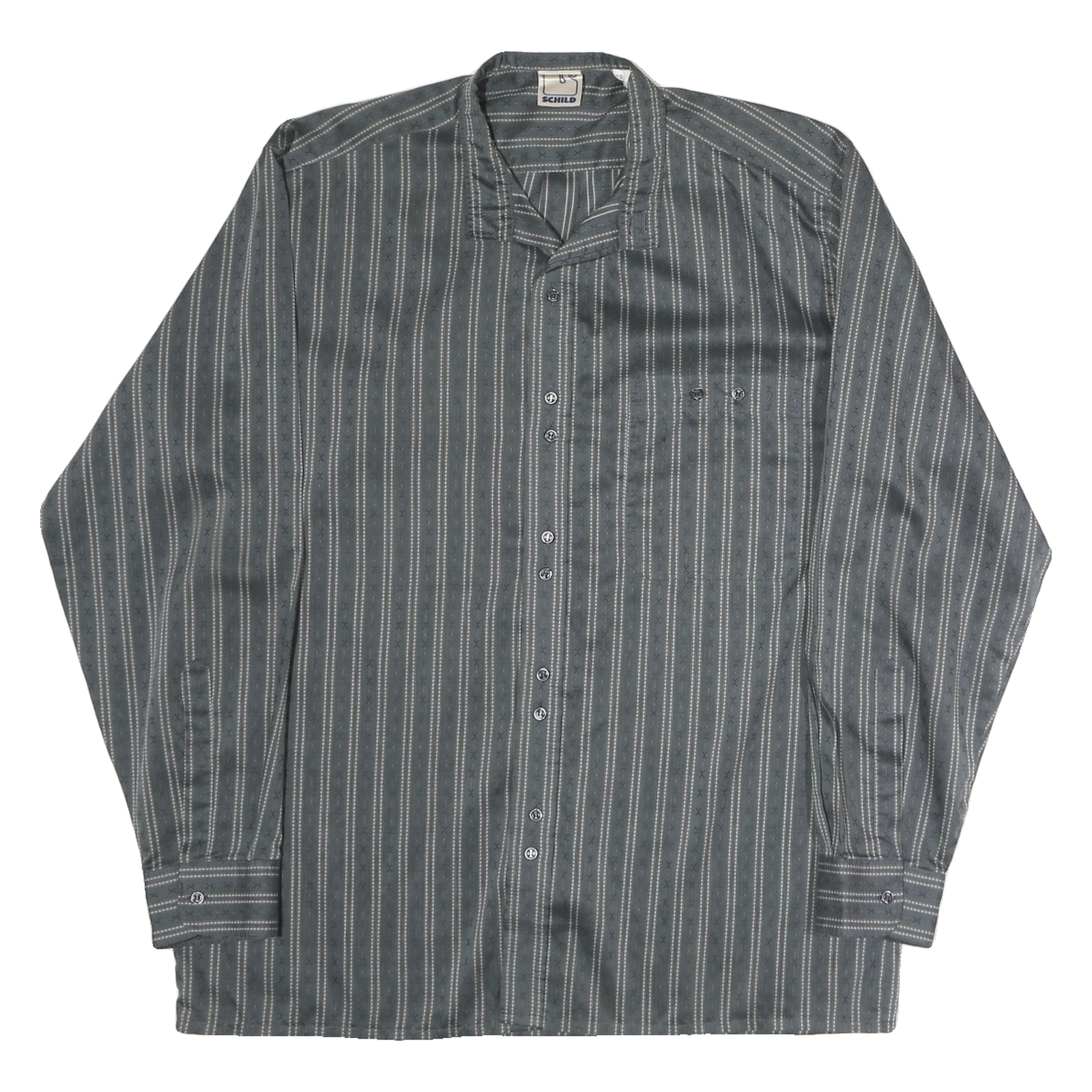 This men's SCHILD shirt features a grey base colour with white vertical stripes and intricate cross-stitch detailing, creating a subtle and classic pattern. The shirt has a button closure and a distinctive band collar, setting it apart with a modern vintage style.
