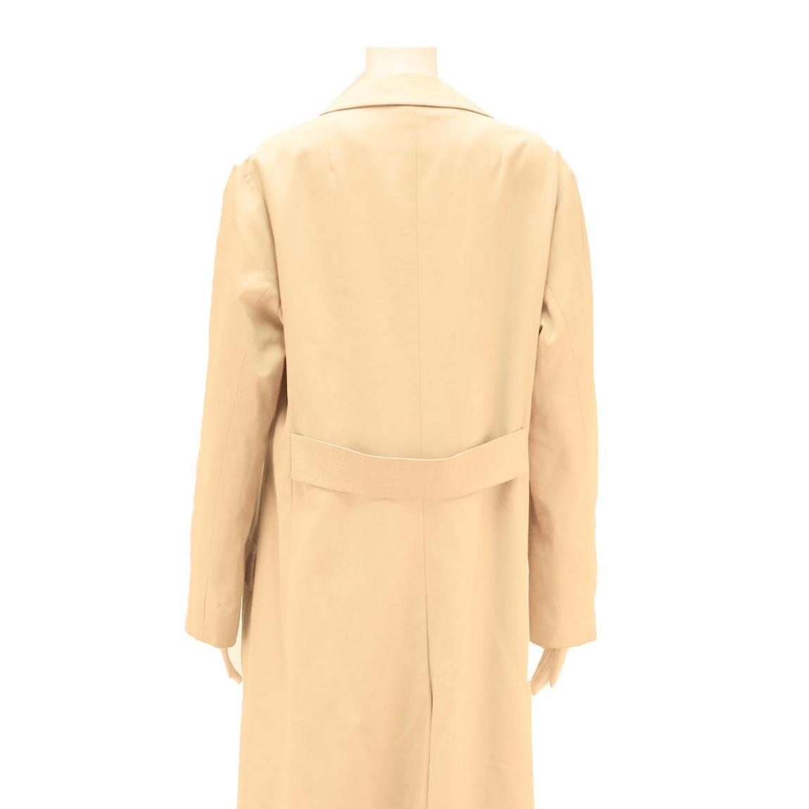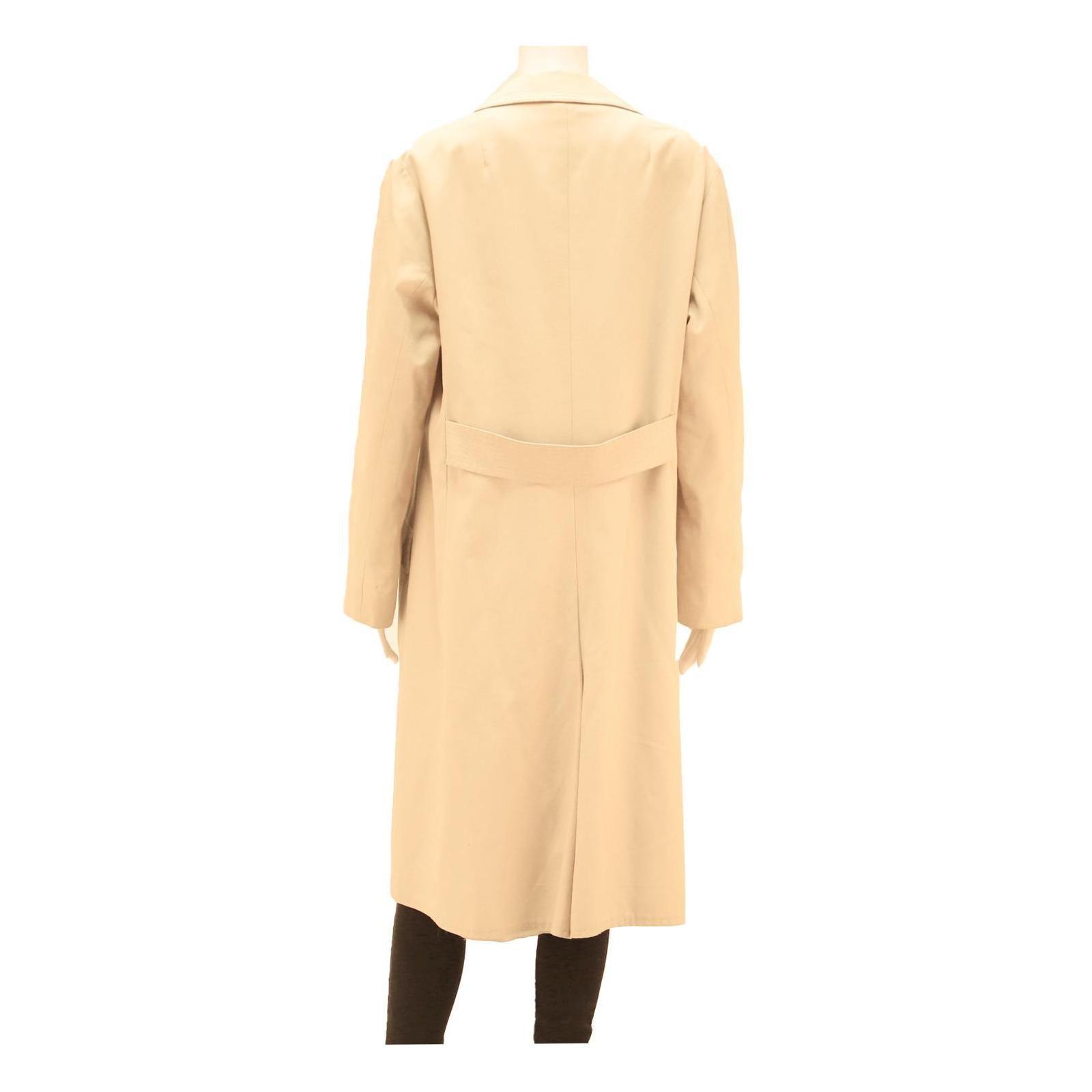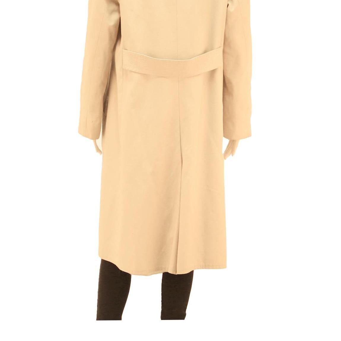 This womens jacket by Stoffels features a soft beige colour crafted from a comfortable cotton blend fabric. It has a classic long silhouette with a button closure down the front and a pointed collar. The jacket also includes flap pockets on the front and a subtle back belt detail for shaping.