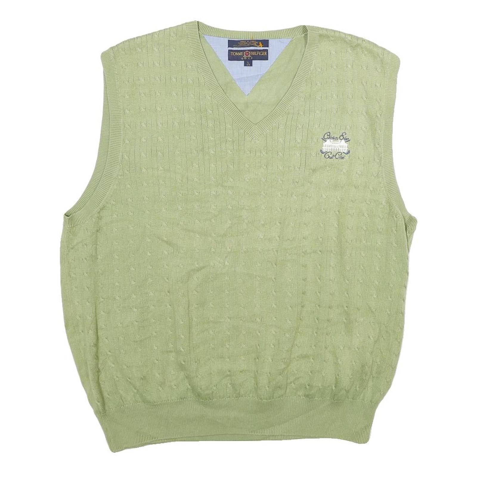 TOMMY HILFIGER Mens Green Cable Knit Cotton Sleeveless V-Neck Jumper L Sweater