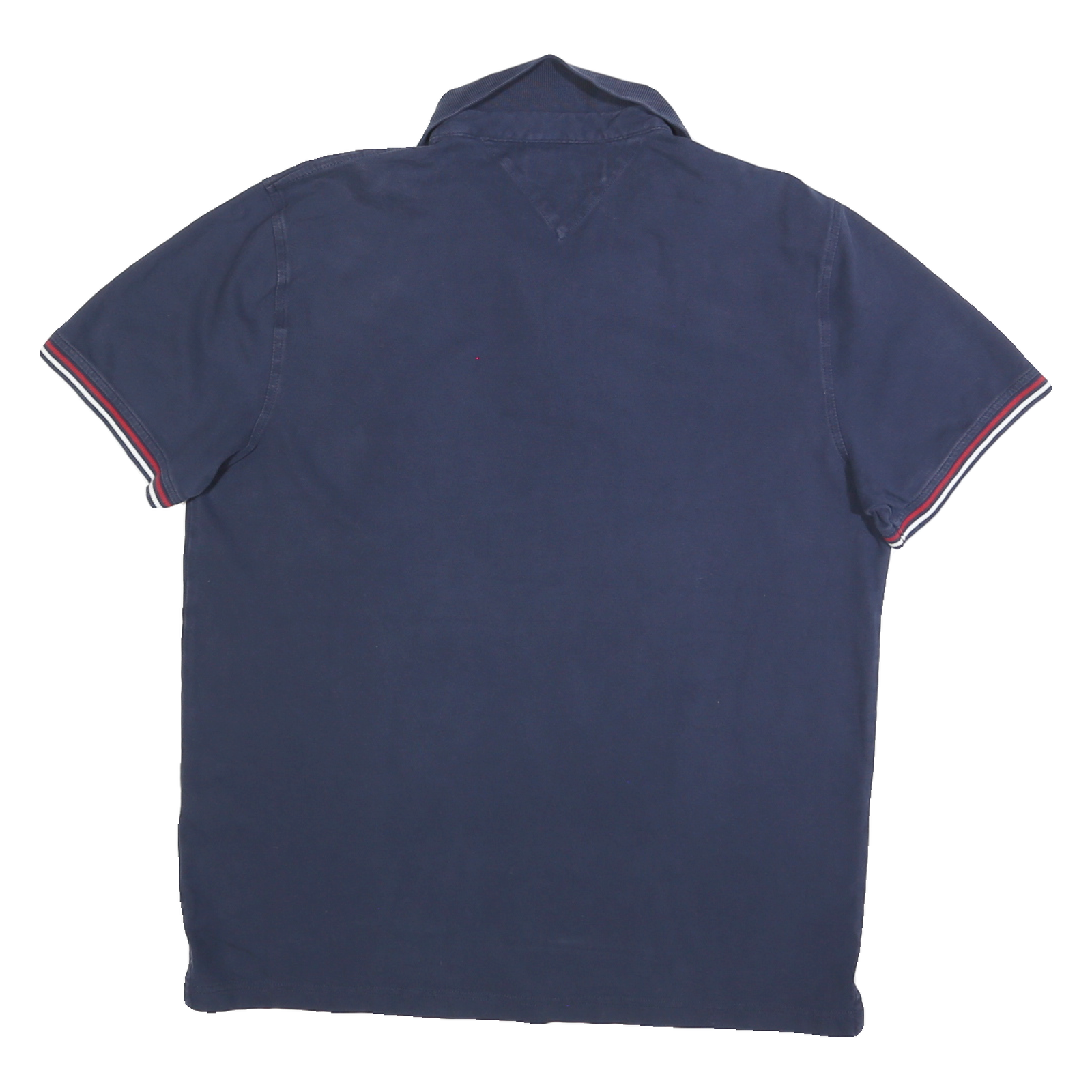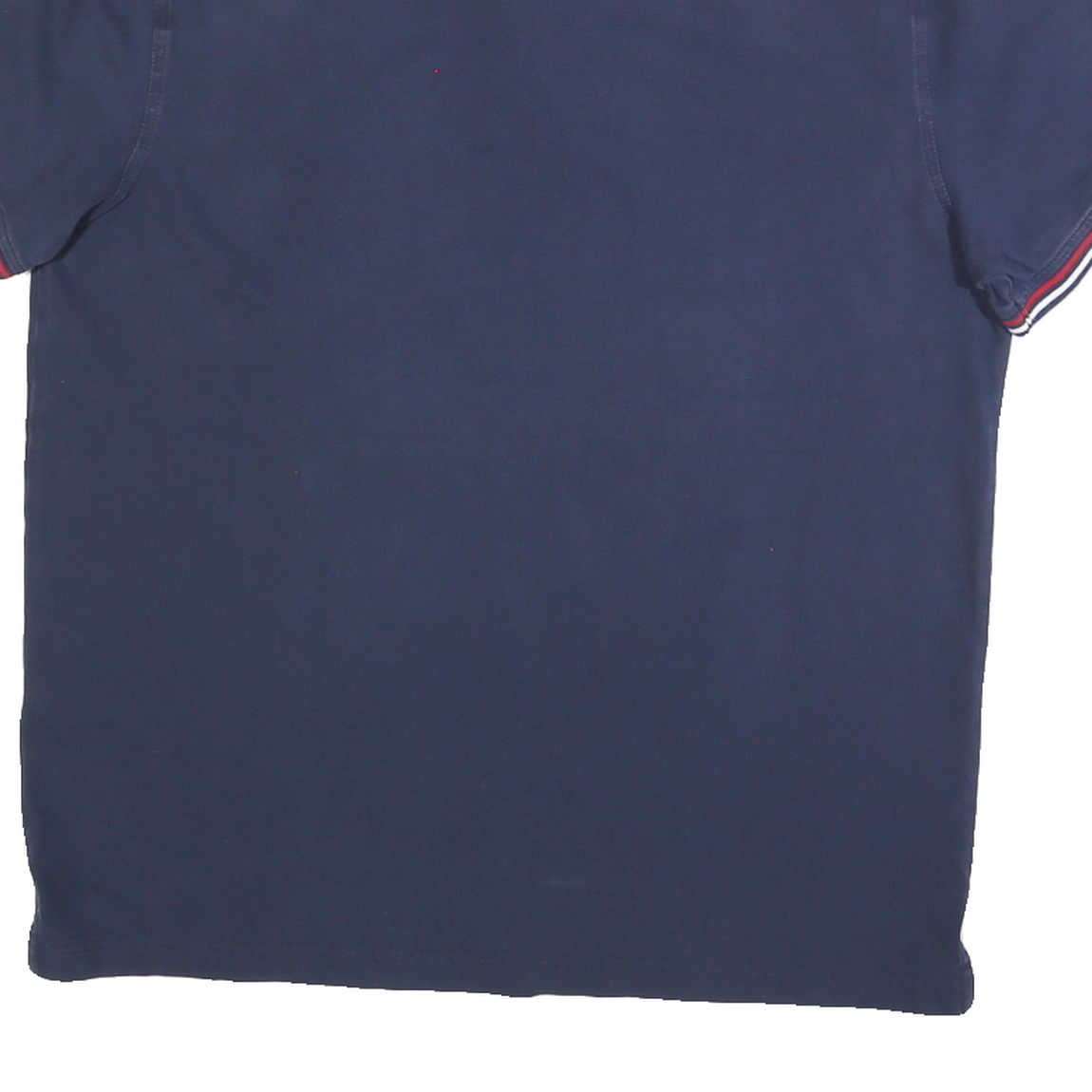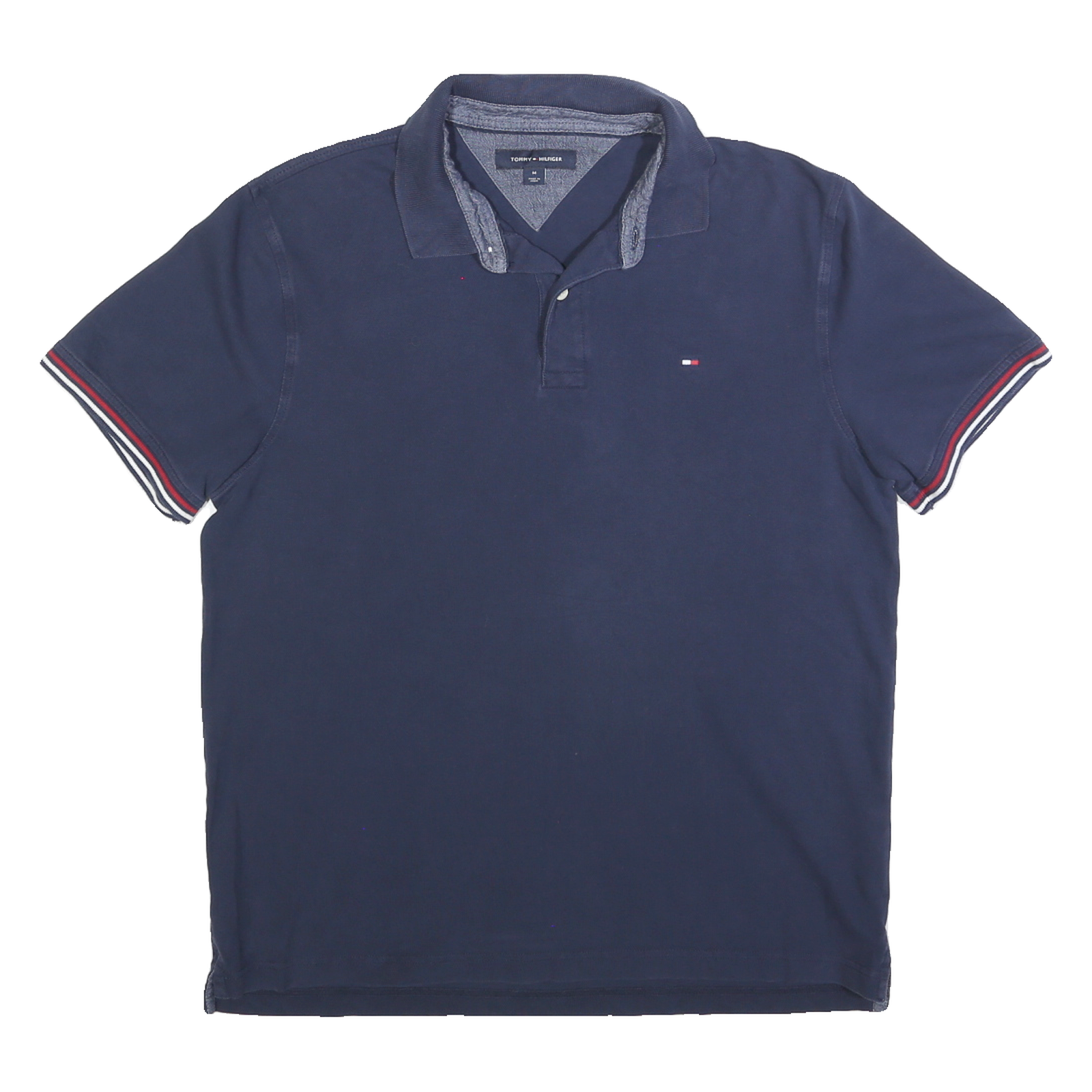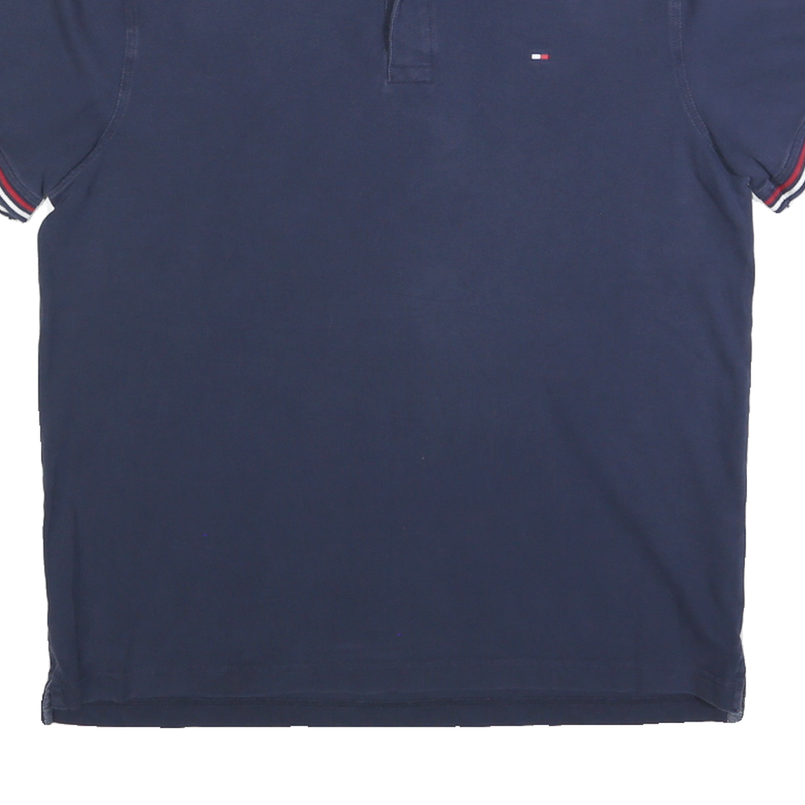 This Tommy Hilfiger Mens polo shirt is crafted in a deep navy blue cotton blend fabric, offering a soft, comfortable feel with durability. The shirt features a classic polo collar with a two-button placket and short sleeves. The ribbed cuffs on the sleeves have contrasting red, white, and navy stripes, adding a distinctive detail to the design.