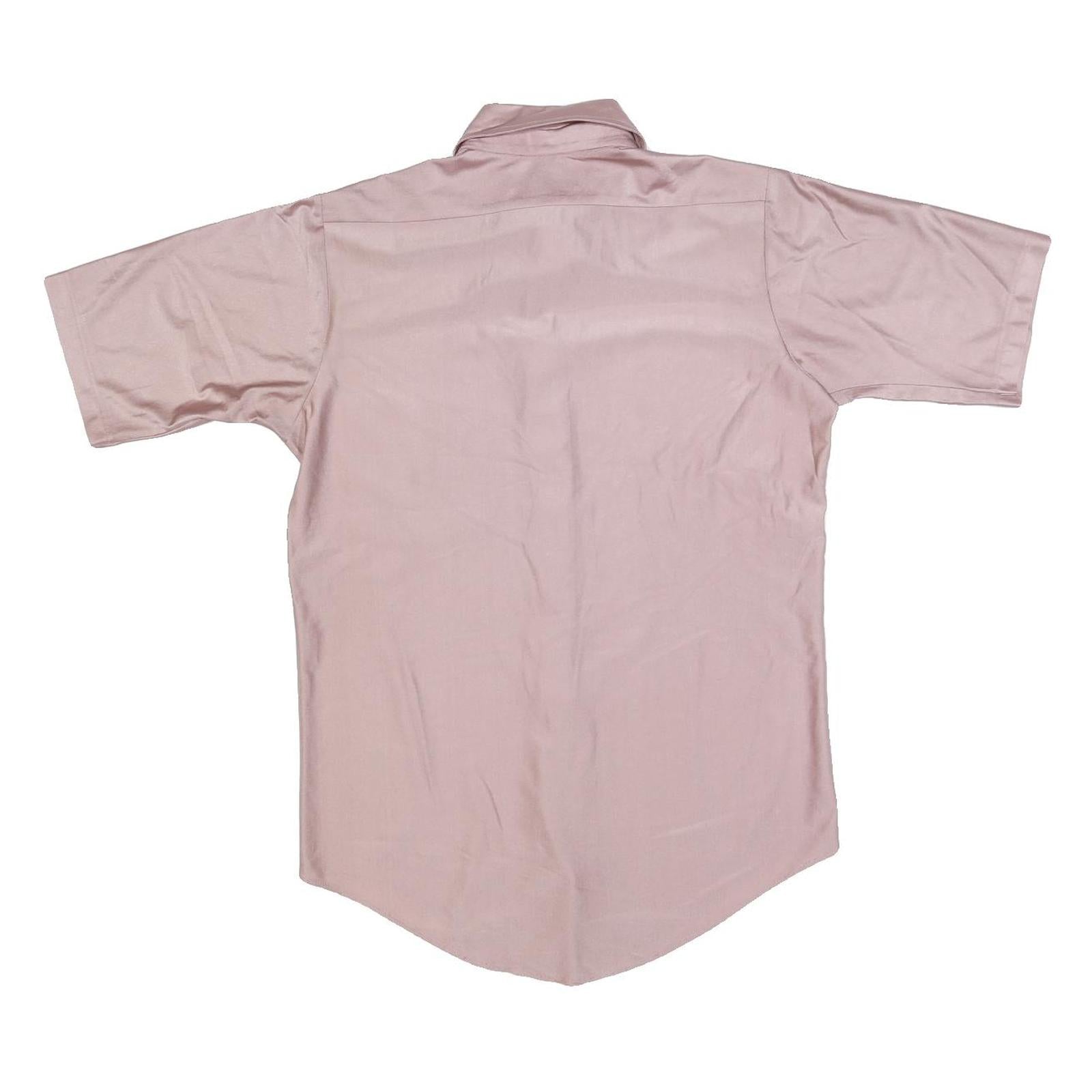 This Van Heusen mens shirt features a soft pink hue crafted from smooth nylon fabric for a lightweight and comfortable feel. It has a classic button closure down the front and a point collar that adds a touch of retro style. The short sleeves provide breathability and ease of movement, making it ideal for warmer weather.