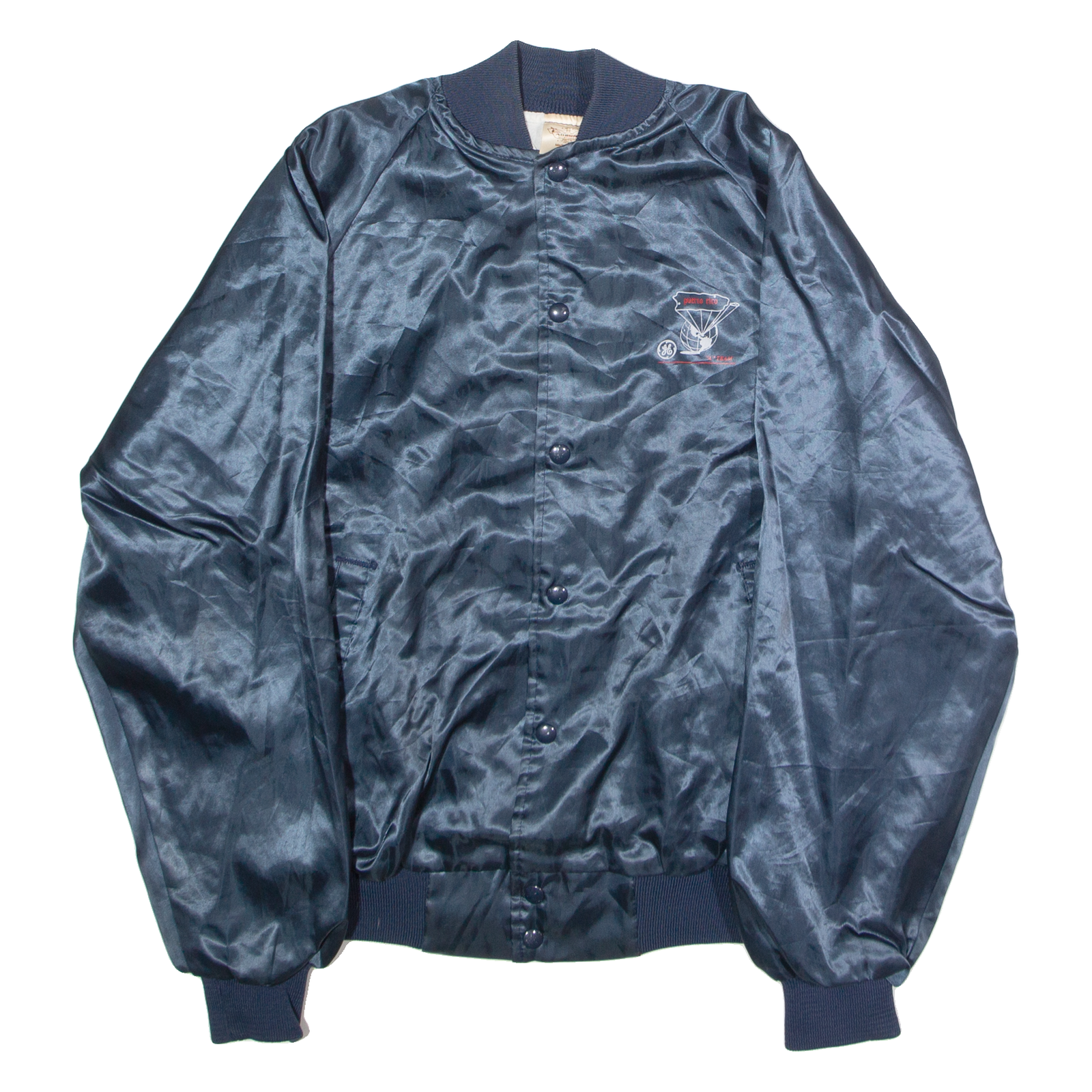 AUBURN SPORTSWEAR General Electric A-Team Puerto Rico Mens Bomber Jacket Blue Satin Nylon 90s USA L