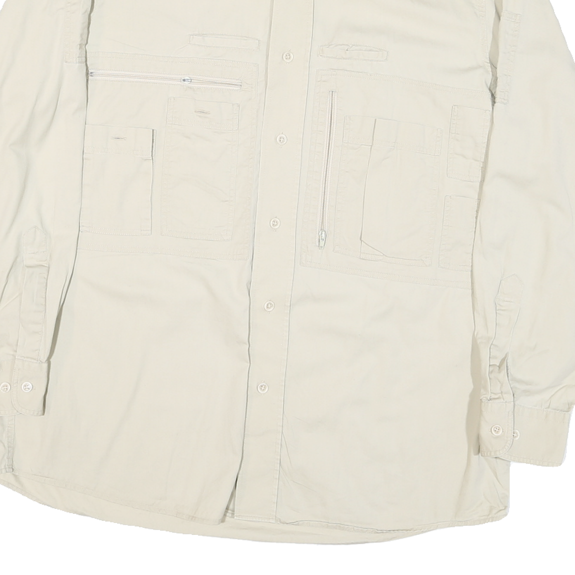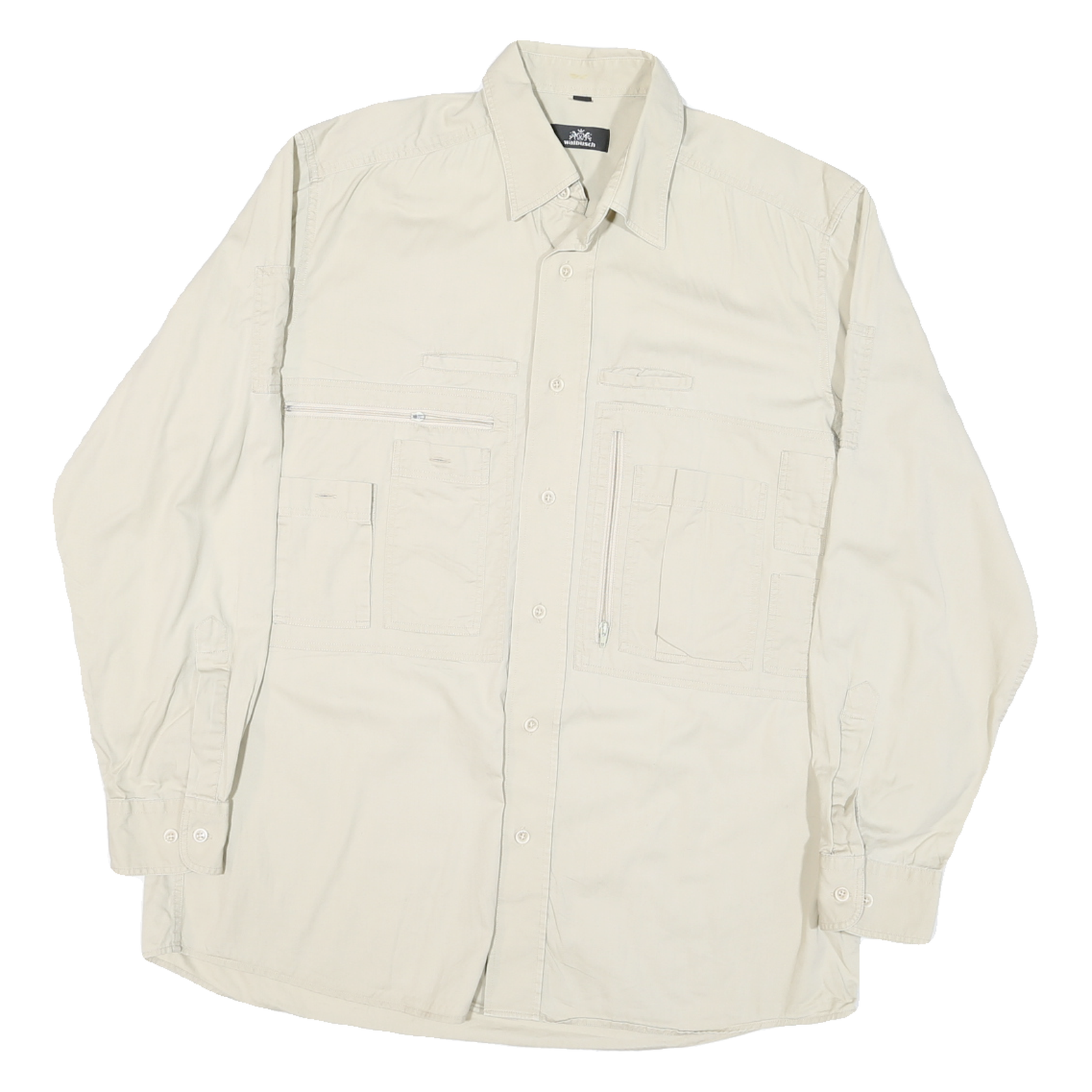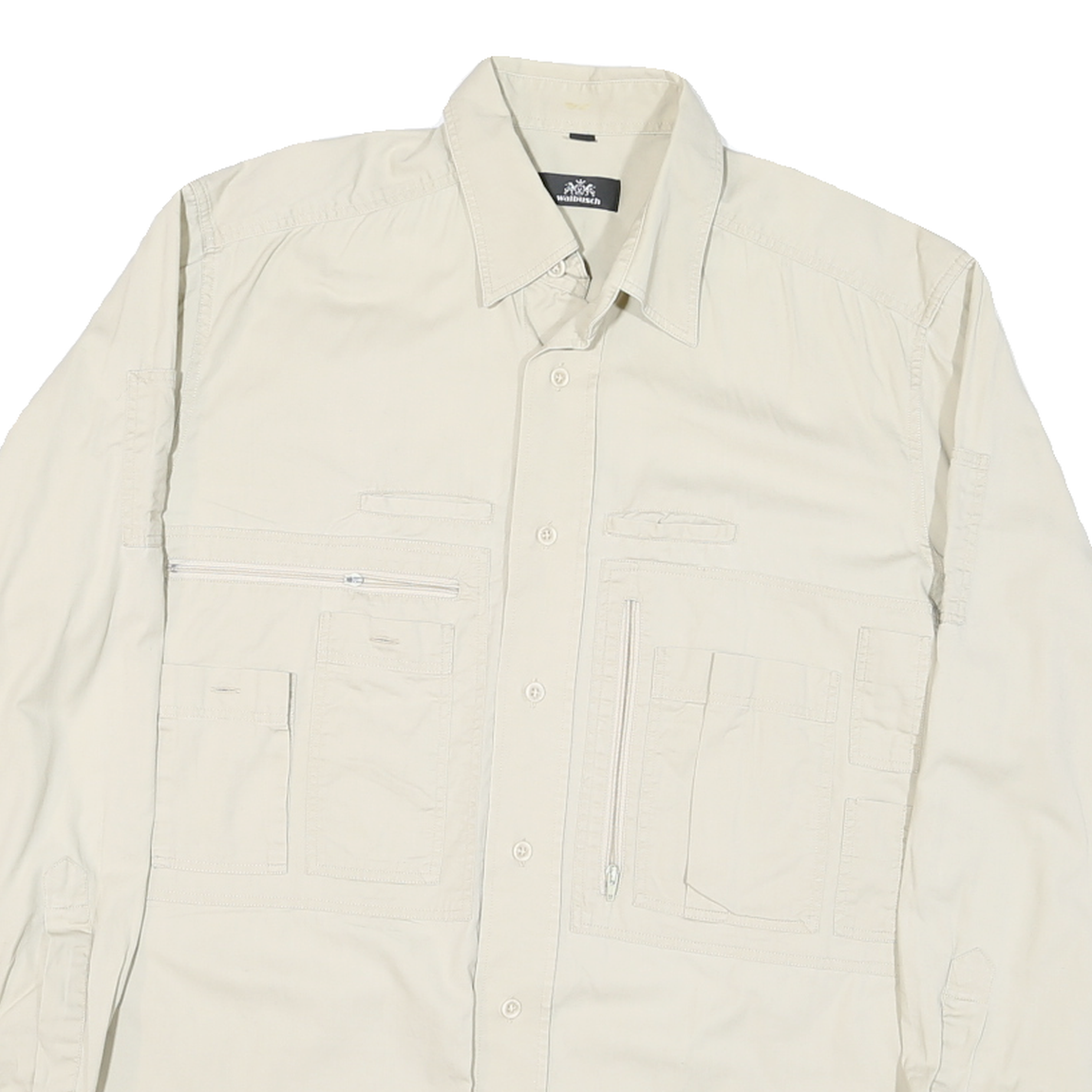 This Mens shirt from Walbusch features a beige cream colour crafted from a smooth cotton blend fabric, offering durability with a soft and comfortable feel. The shirt is designed with multiple front pockets including zip and flap closures, adding both utility and style to the practical design.