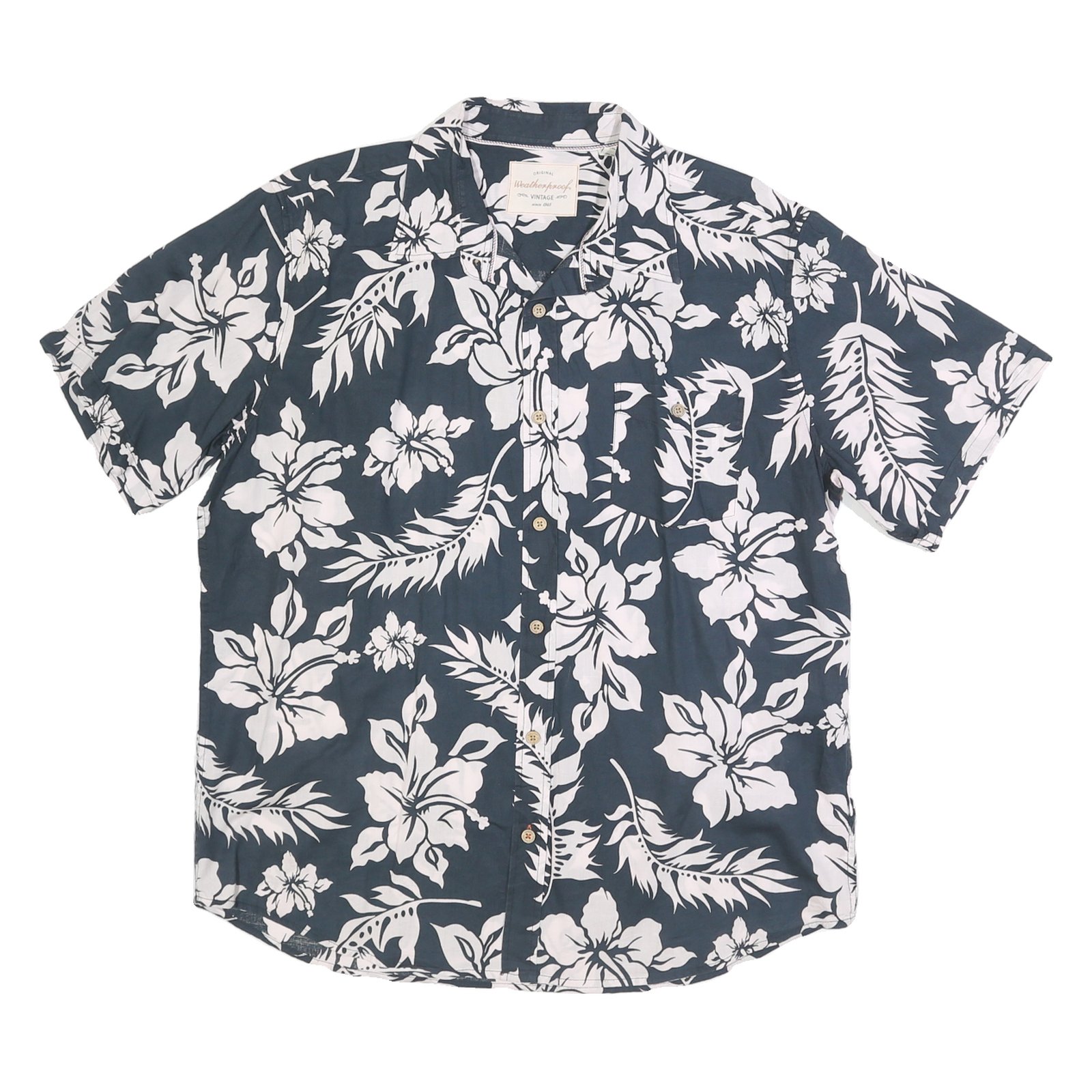 This Weatherproof mens shirt features a deep blue base colour with an all-over bold white floral print, creating a classic tropical look. The shirt has a relaxed fit with short sleeves and a button-up front, equipped with light-coloured buttons and a single chest pocket. The collar is open and casual, perfect for summer wear.