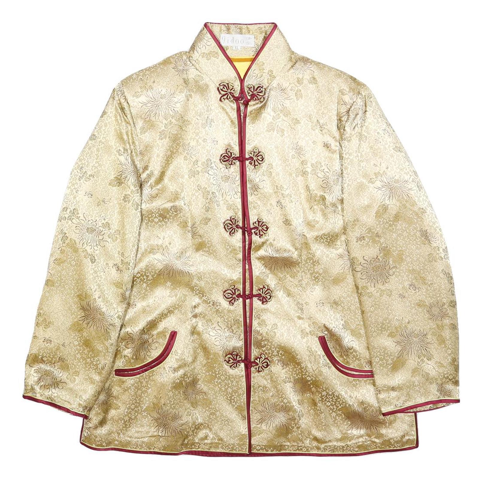This womens jacket features a luxurious beige satin fabric with an intricate floral pattern subtly woven throughout. It is accented with maroon piping along the front button closure, pockets, cuffs, and hem, offering a refined contrast. The jacket has a classic mandarin-style collar and frog button fastenings for a traditional yet elegant look.