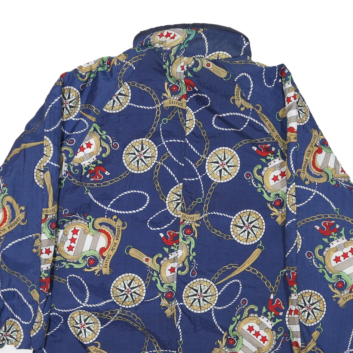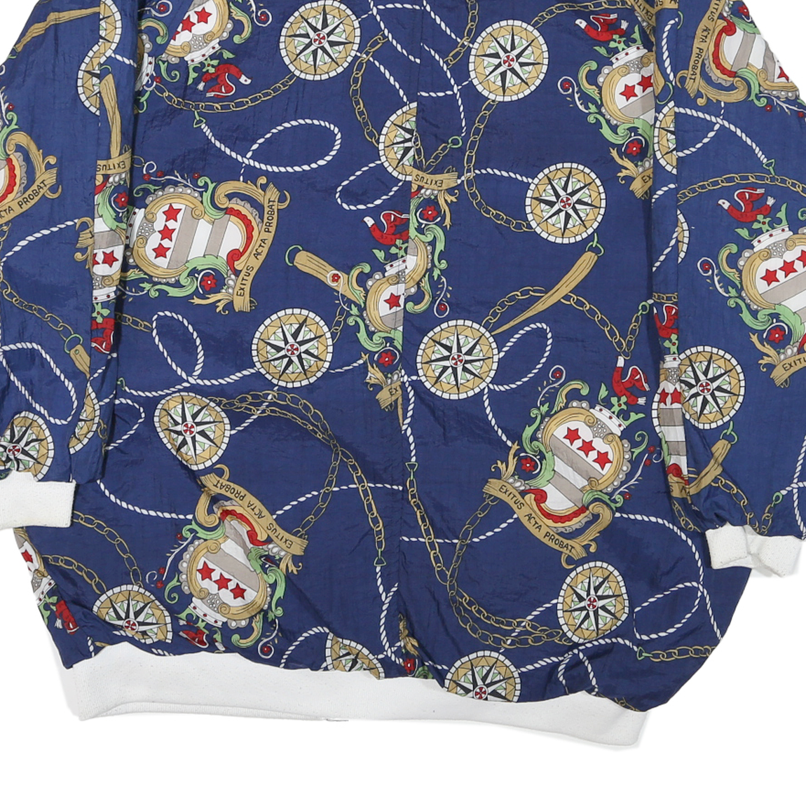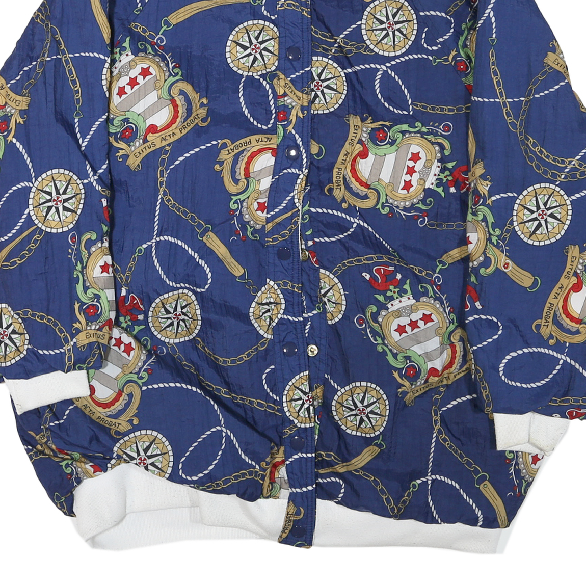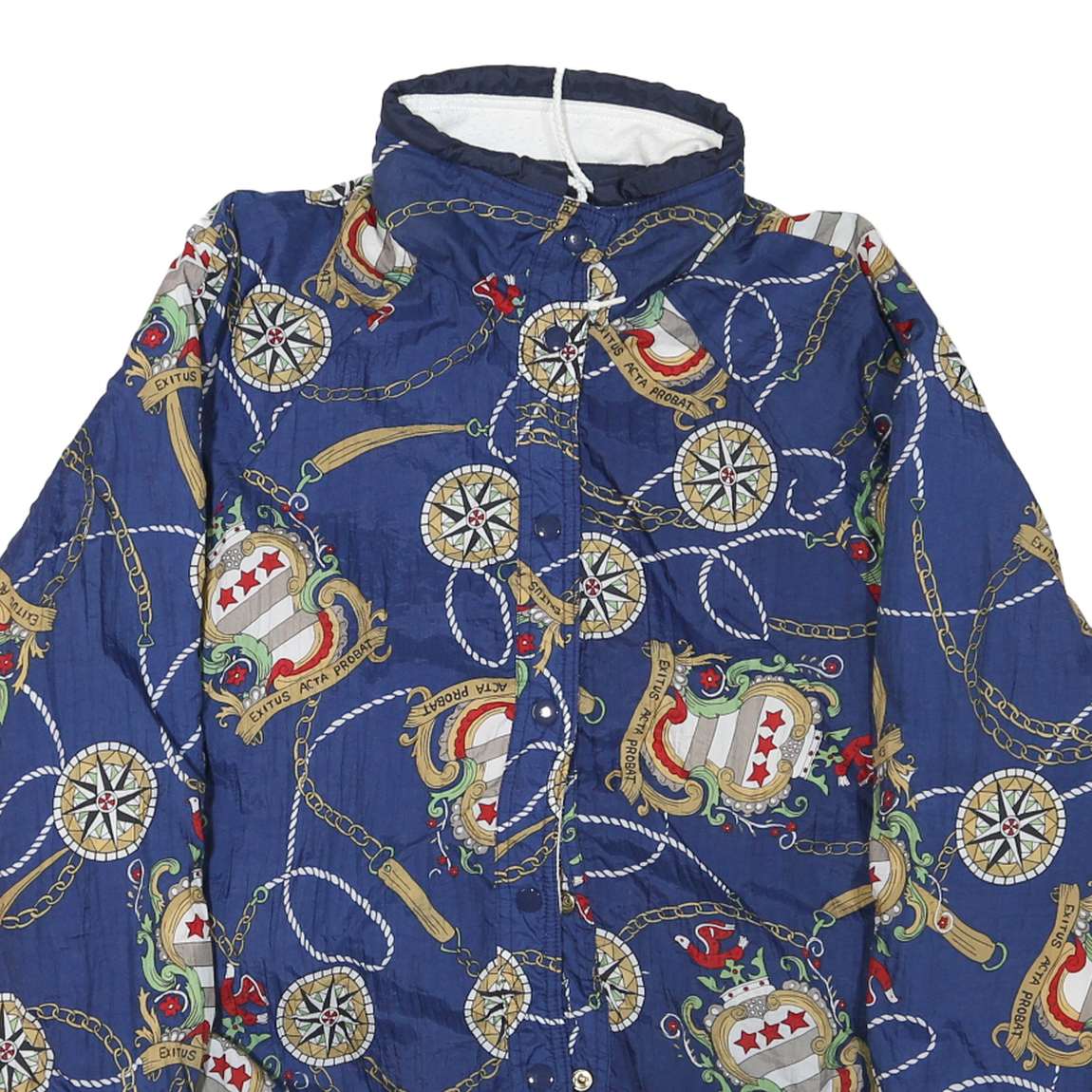 This womens jacket features a bold and intricate nautical-themed print on a deep blue synthetic fabric, embellished with motifs such as compasses, ropes, chains, and heraldic crests in colours like gold, red, white, and green. It fastens with button closures down the front and has a high collar with an adjustable drawstring. The cuffs and hem have white ribbed trims creating a neat finish.