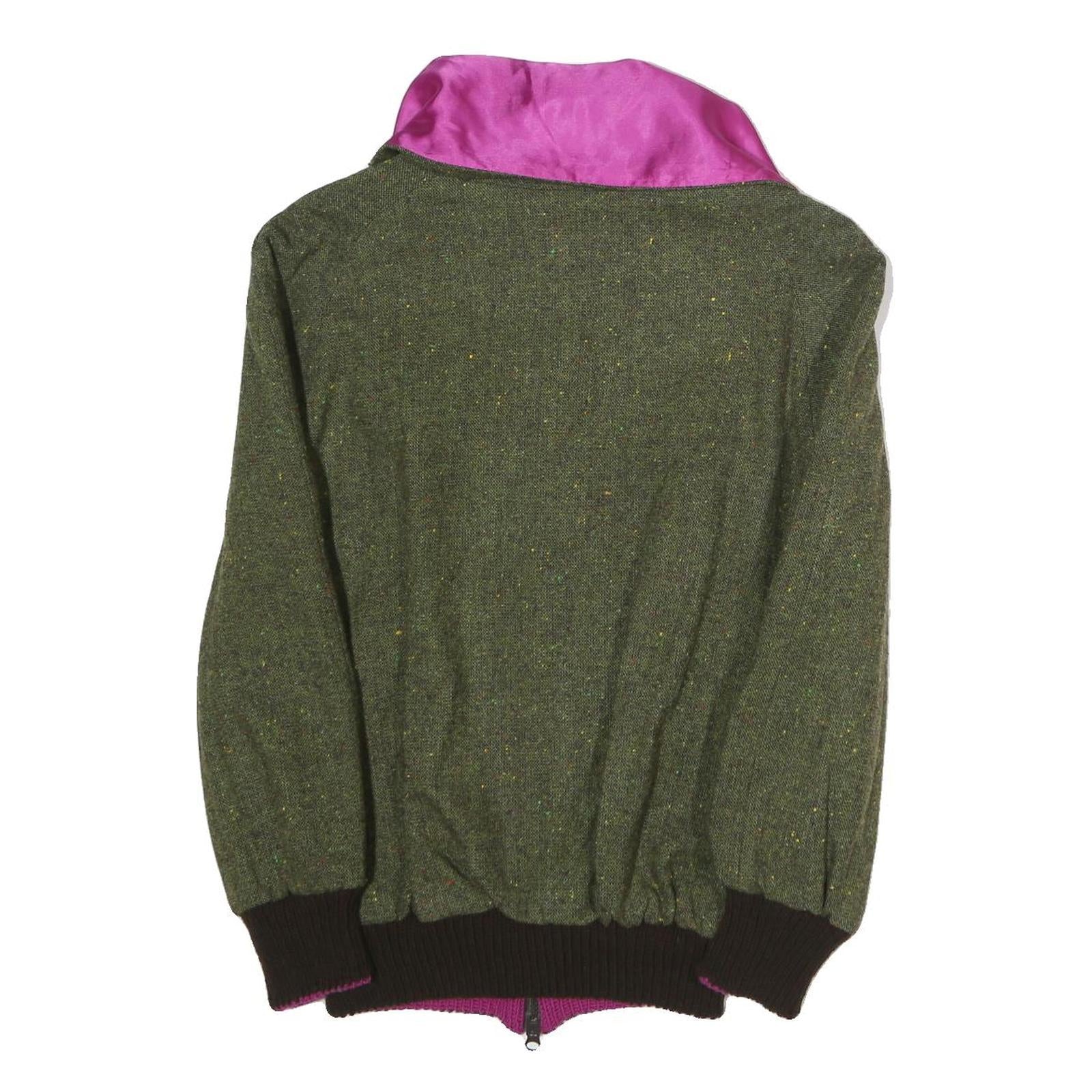 This womens jacket features a deep green colour with subtle multicoloured flecks throughout the wool blend fabric, giving it a textured and rich appearance. The stand-up collar has a striking bright magenta satin lining that adds a vibrant contrast to the outer green. The jacket fastens with a black zip down the centre front and is finished with thick black ribbed cuffs and hem for a snug and comfortable fit.
