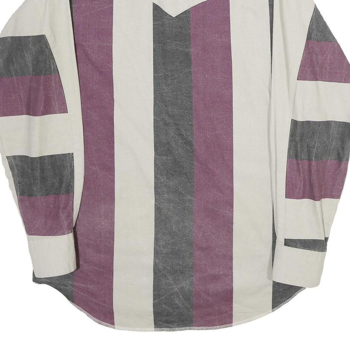 Made from 100% cotton, this vintage shirt offers a soft and breathable feel with a structured yet comfortable fit. The neutral beige background complemented by the faded purple and grey stripes gives it a retro western vibe that can pair well with jeans or casual trousers.